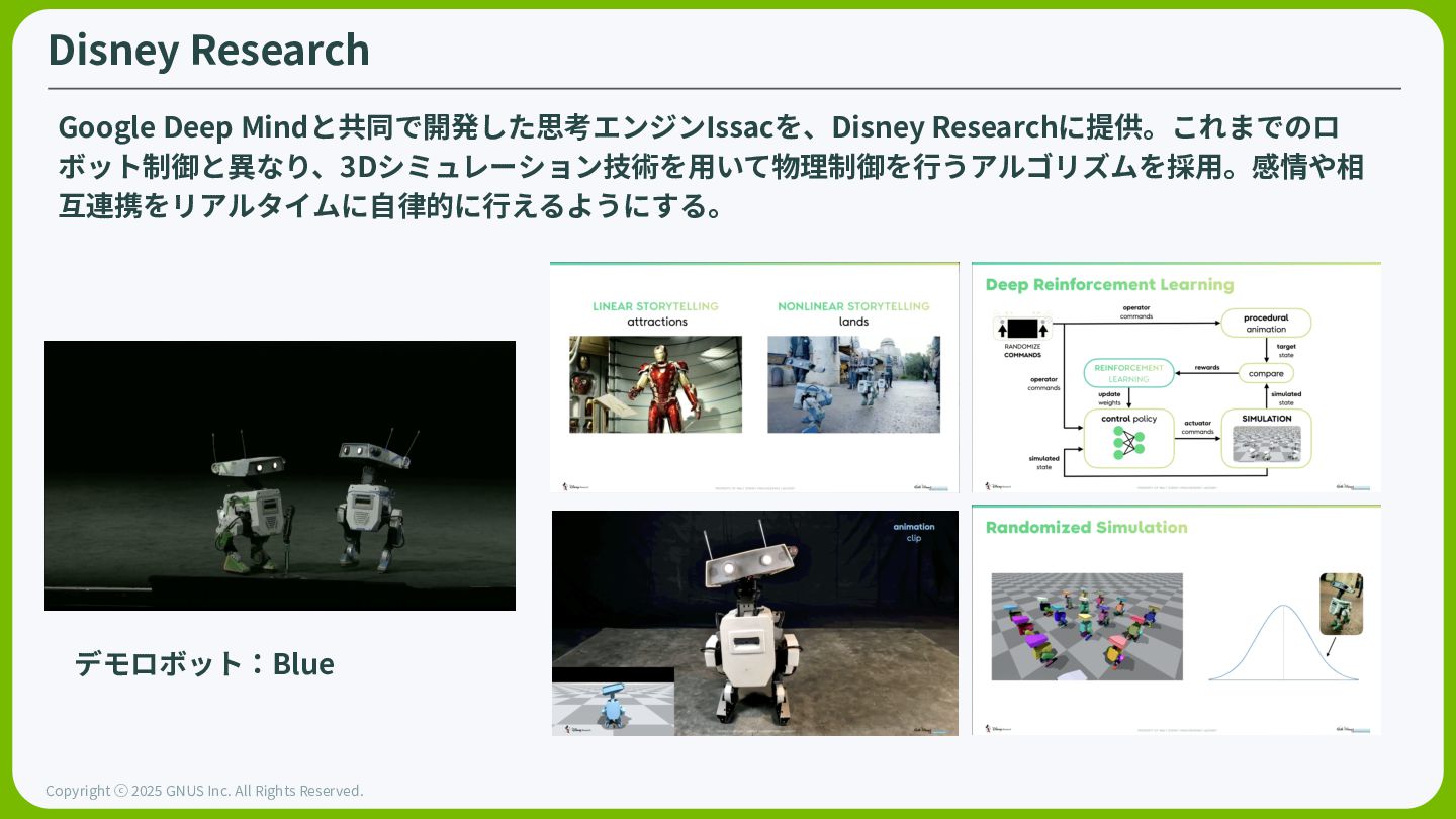 ⓒ 2025 GNUS Inc. All Rights Reserved. Disney Research Google Deep Mindと共同で開発した思考エンジンIssacを、Disney Researchに提供。これまでのロ ボット制御と異なり、3Dシミュレーション技術を⽤いて物理制御を⾏うアルゴリズムを採⽤。感情や相 互連携をリアルタイムに⾃律的に⾏えるようにする。 デモロボット:Blue