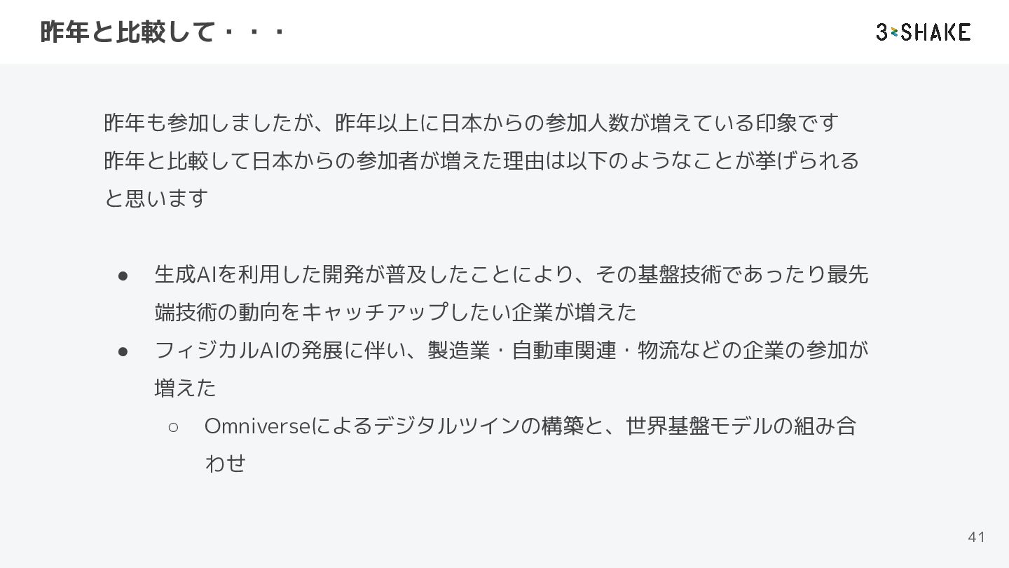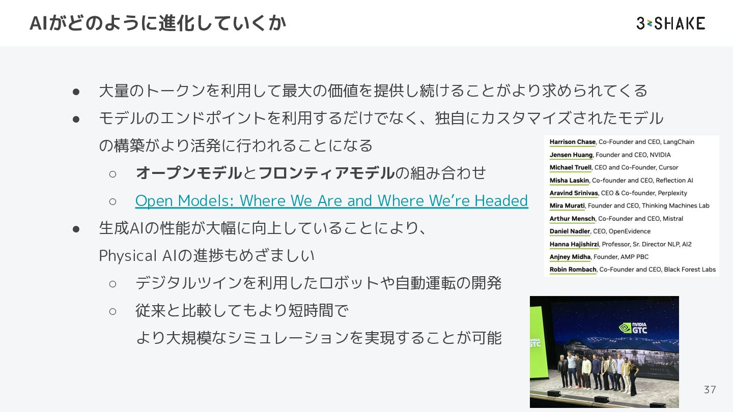 Open Models: Where We Are and Where We’re Headed • 生成AIの性能が大幅に向上していることにより、 Physical AIの進捗もめざましい ◦ デジタルツインを利用したロボットや自動運転の開発 ◦ 従来と比較してもより短時間で より大規模なシミュレーションを実現することが可能