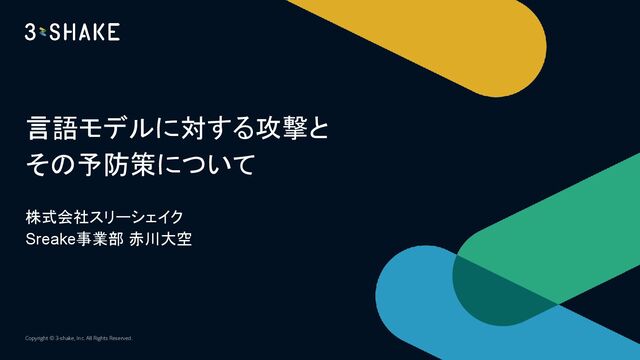 言語モデルに対する攻撃と その予防策について 株式会社スリーシェイク Sreake事業部 赤川大空 Copyright © 3-shake, Inc. All
