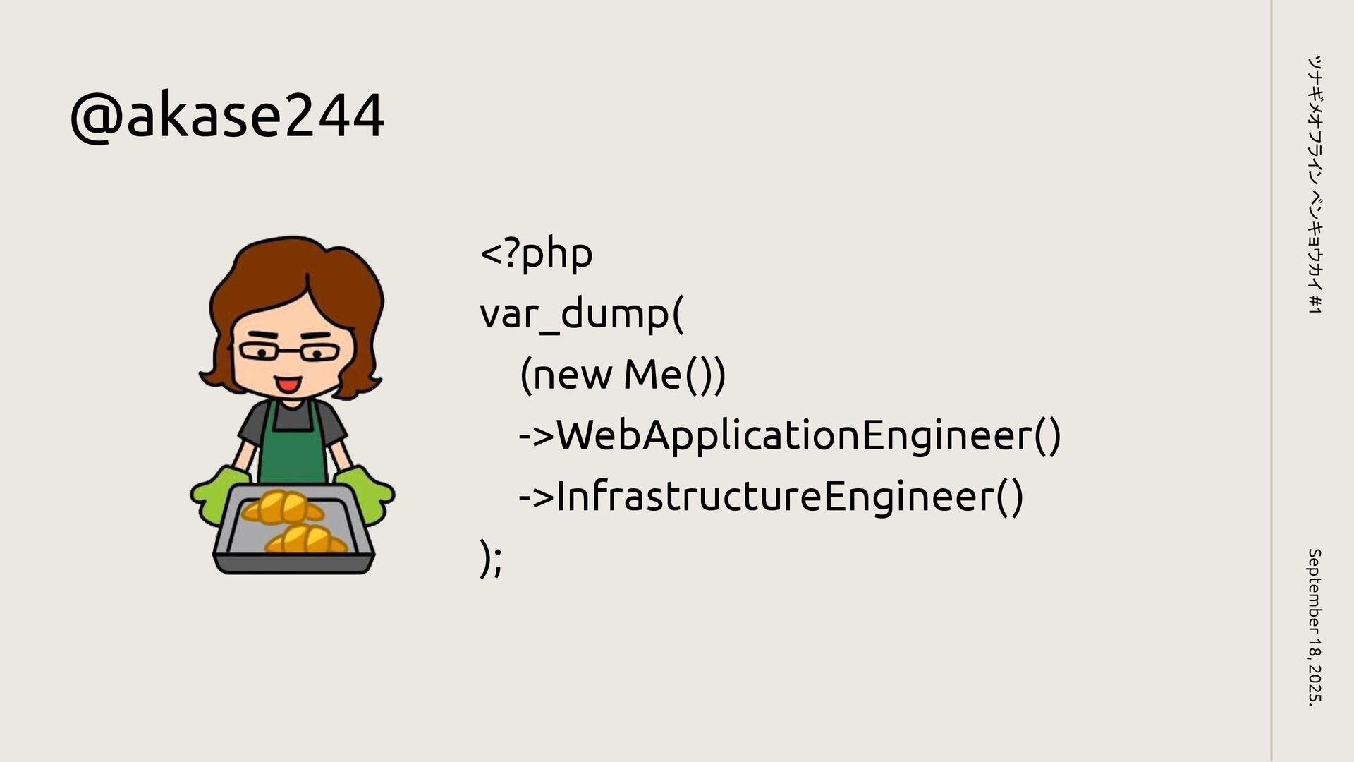 @akase244 September 18, 2025. ツナギメオフライン ベンキョウカイ #1 <?php var_dump( (new