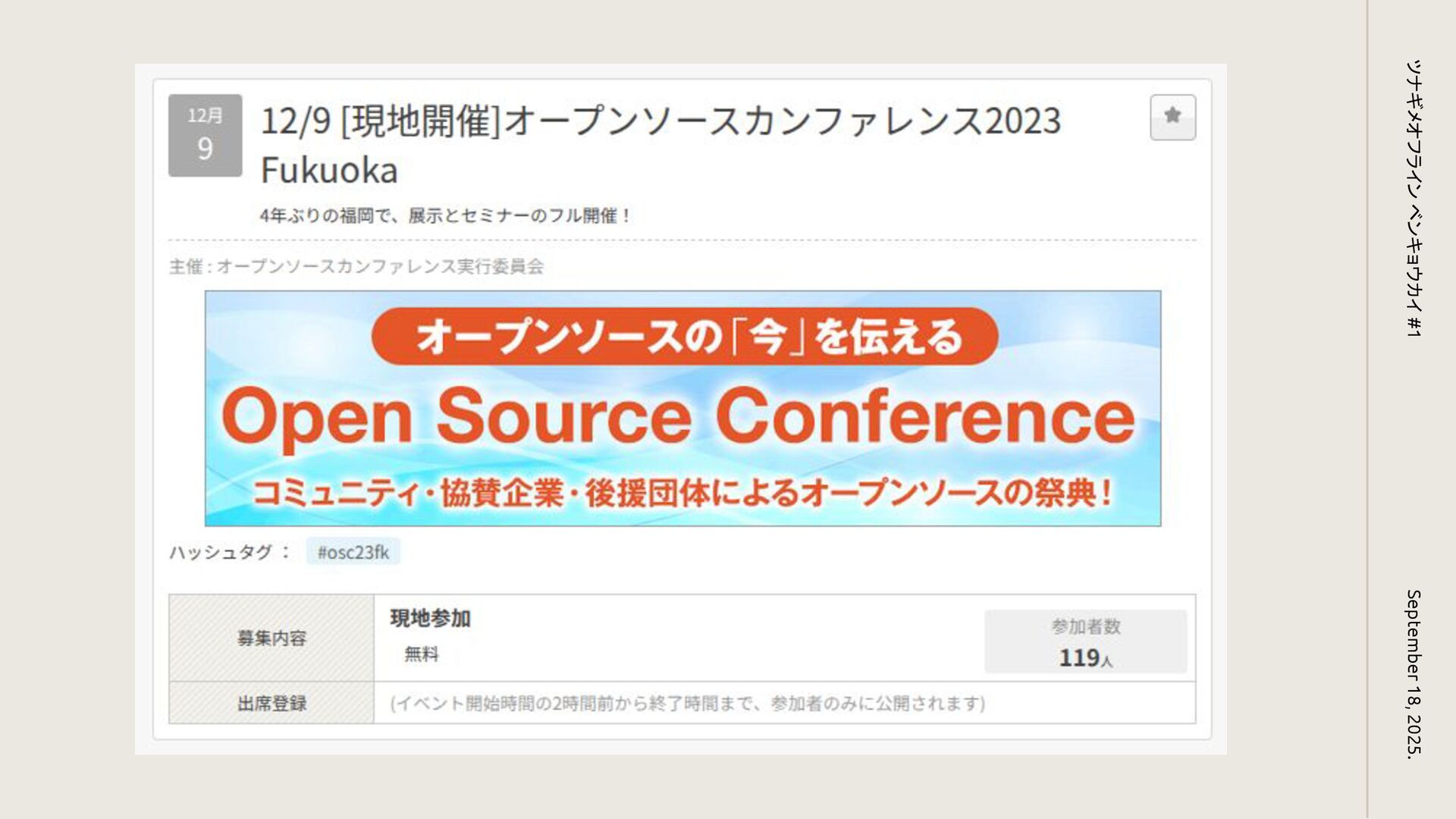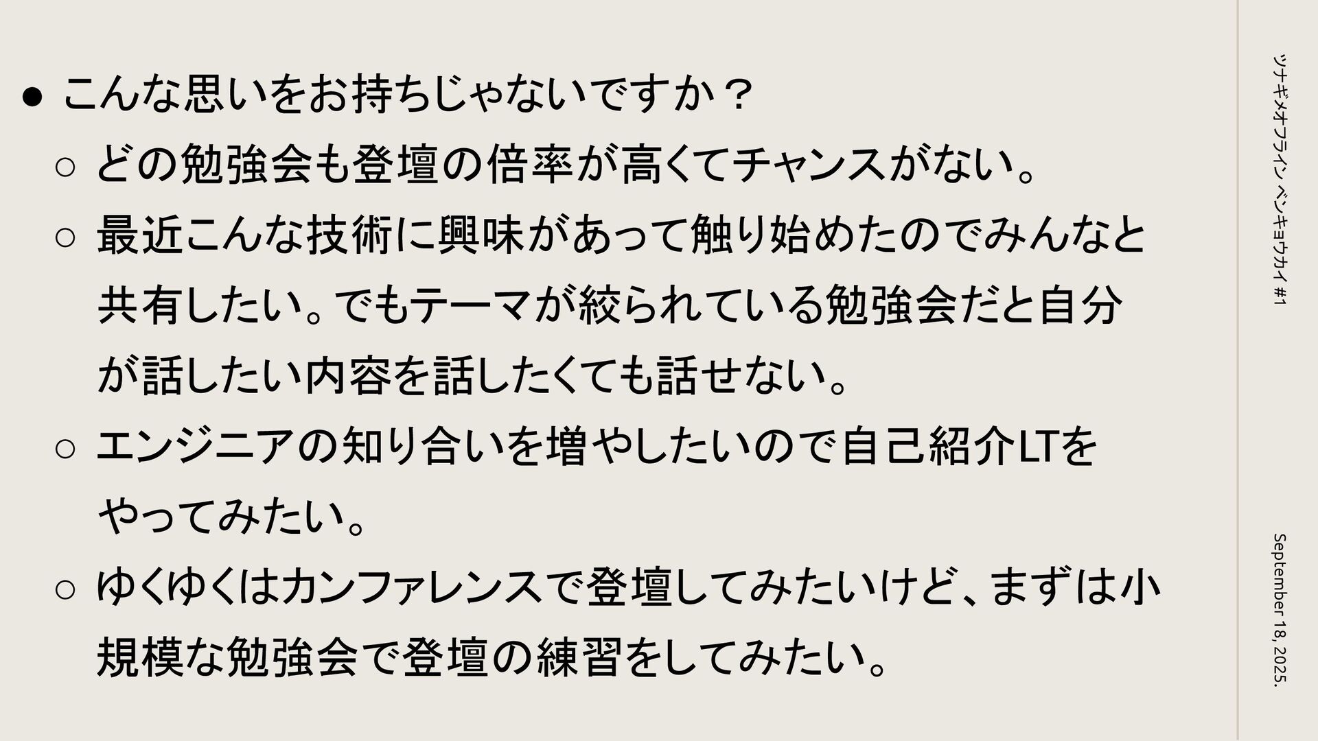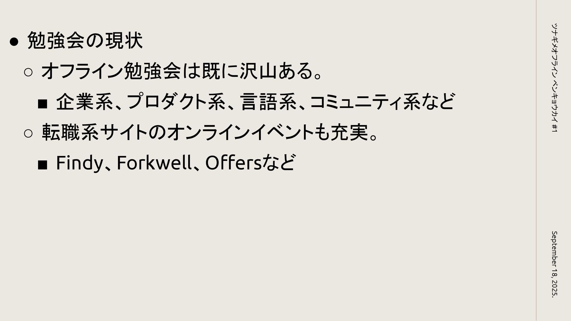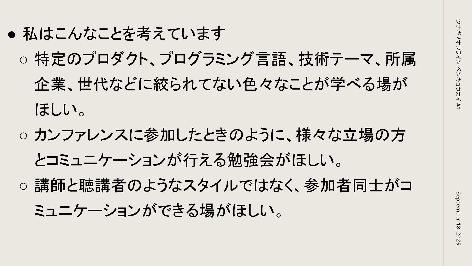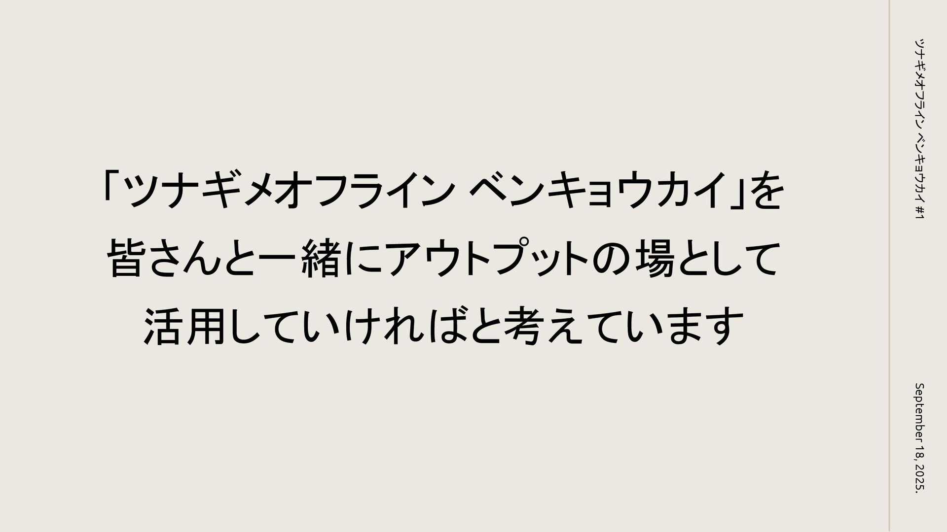 「ツナギメオフライン ベンキョウカイ」を 皆さんと一緒にアウトプットの場として 活用していければと考えています September 18, 2025. ツナギメオフライン ベンキョウカイ #1