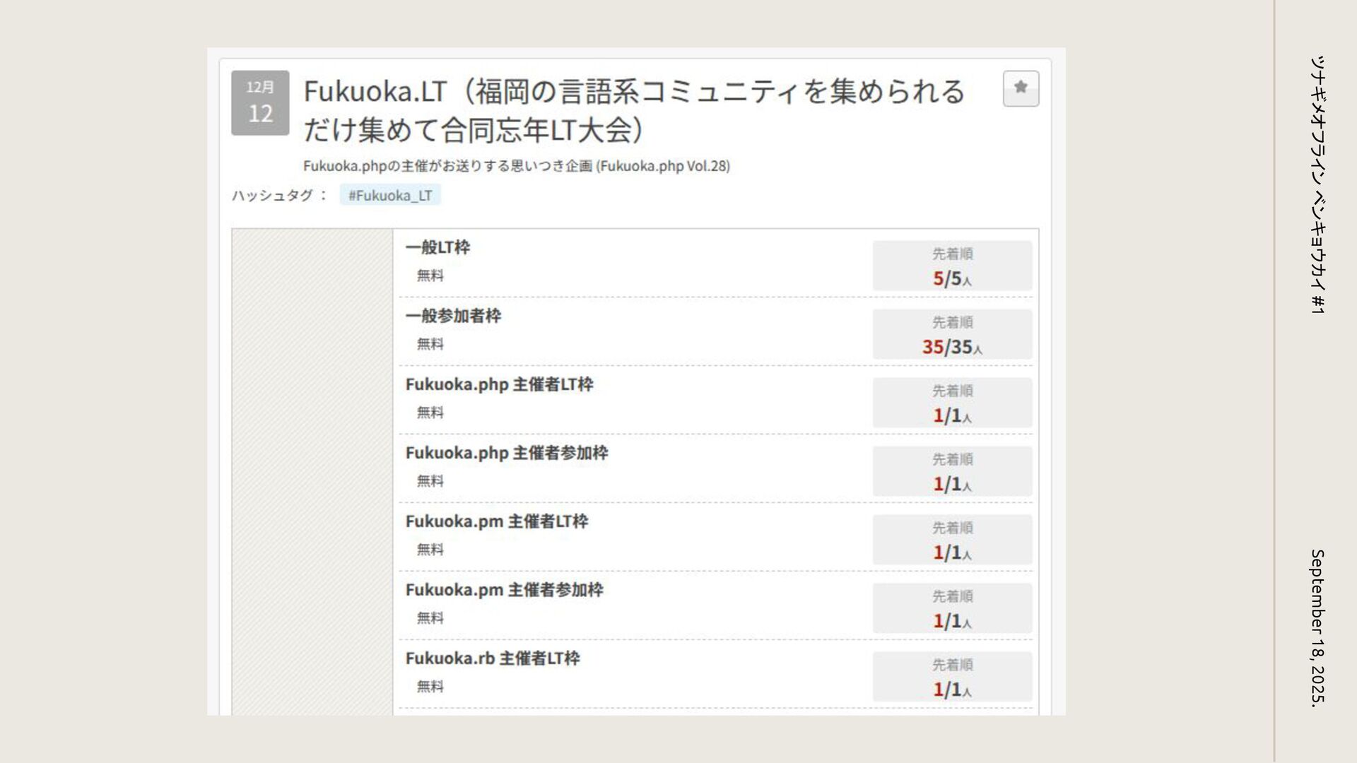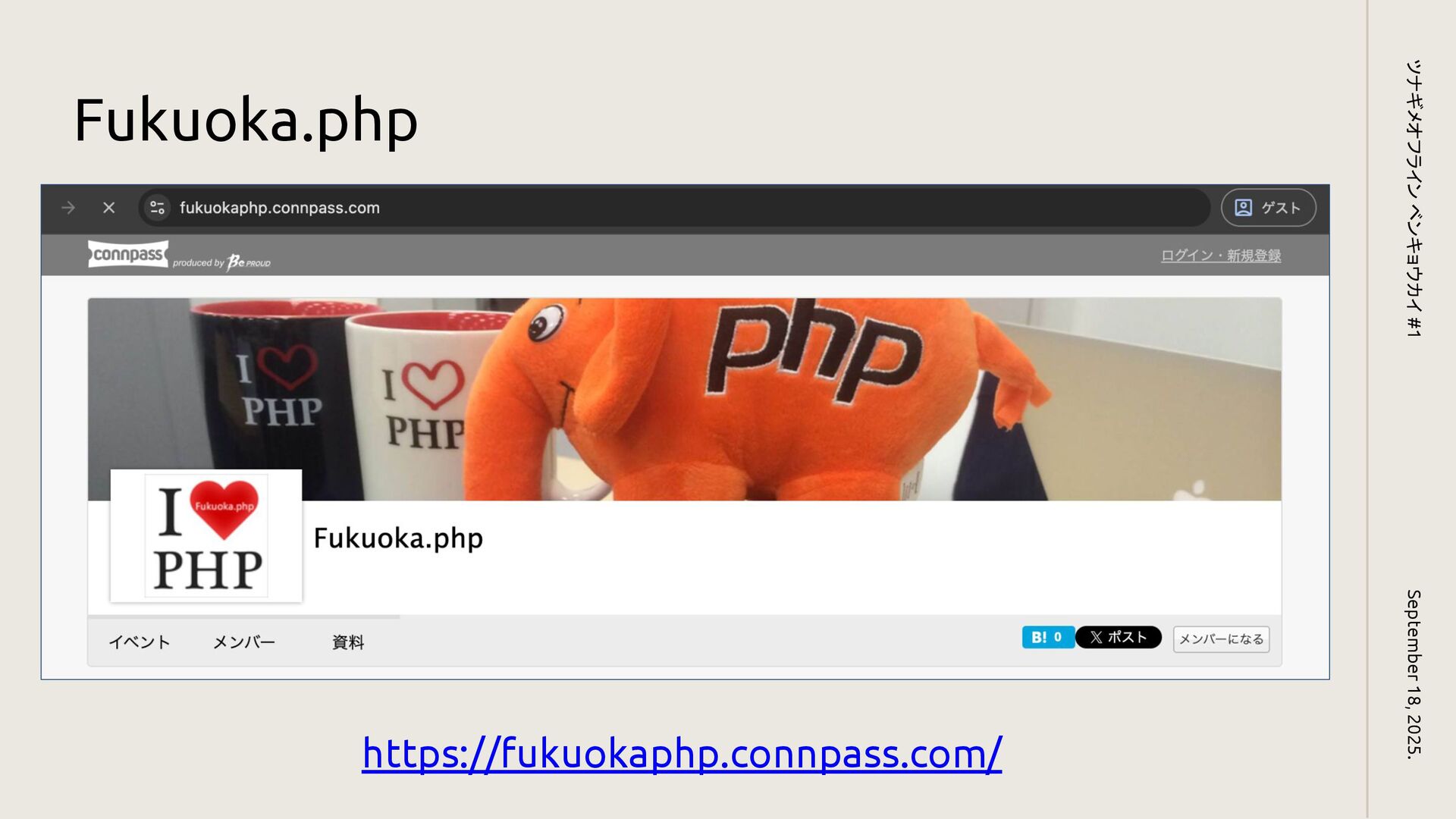 Fukuoka.php https://fukuokaphp.connpass.com/ September 18, 2025. ツナギメオフライン ベンキョウカイ #1