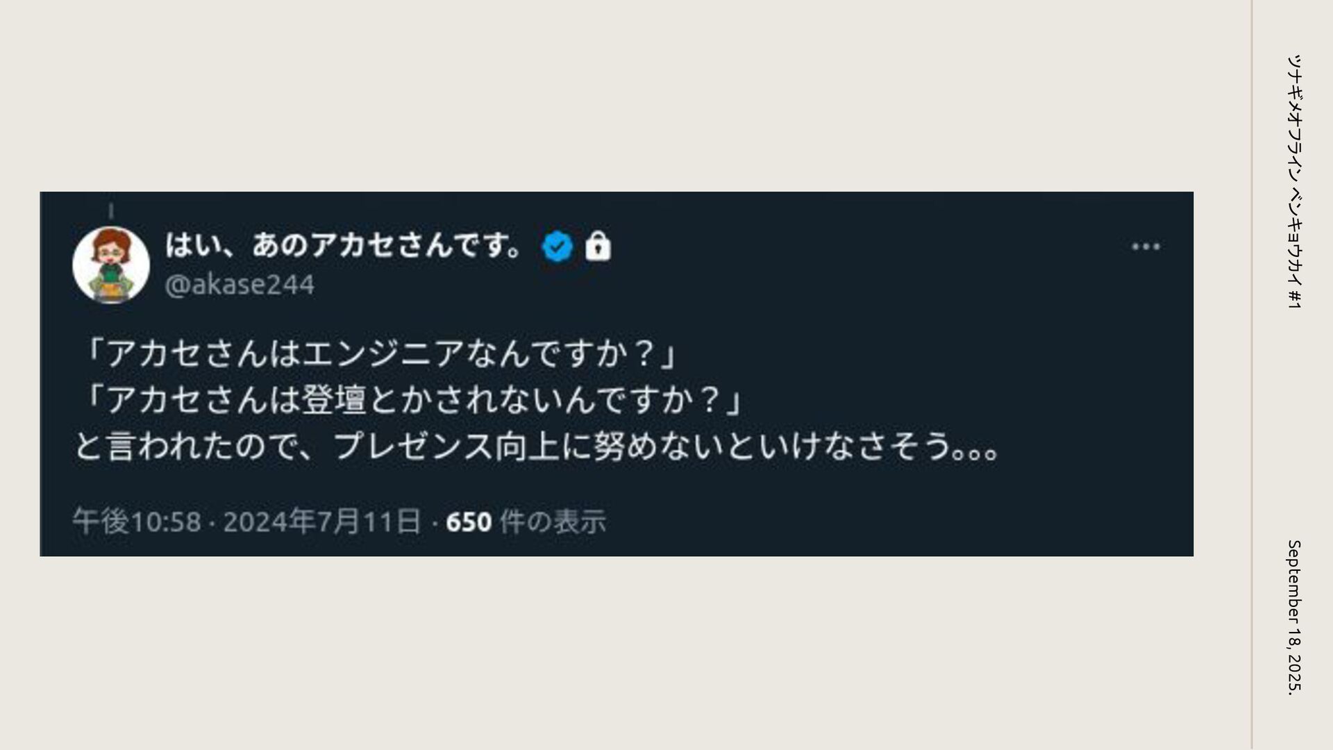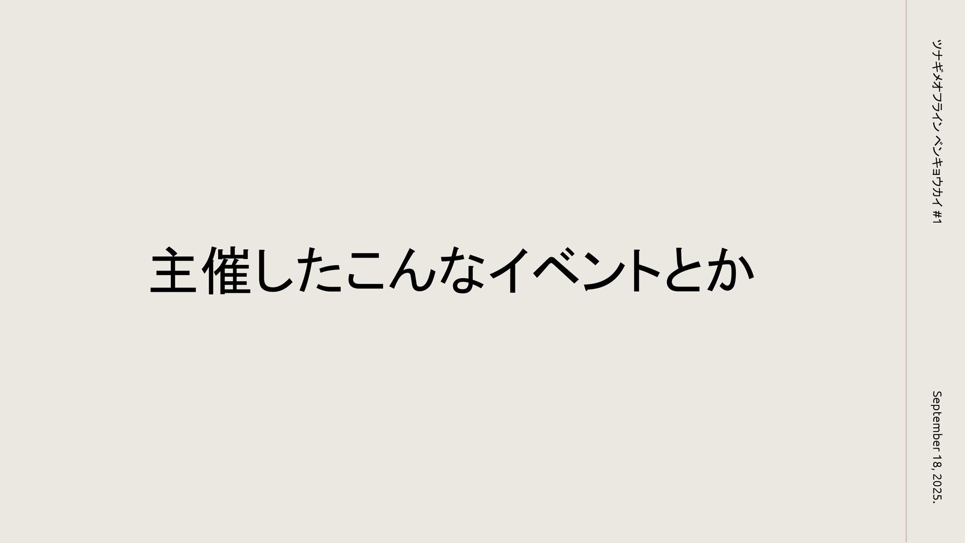 たしかに最近は登壇少なめですが。。。 September 18, 2025. ツナギメオフライン ベンキョウカイ #1
