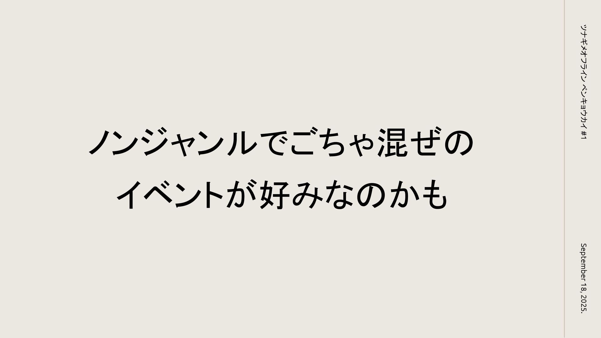 ノンジャンルでごちゃ混ぜの イベントが好みなのかも September 18, 2025. ツナギメオフライン ベンキョウカイ #1