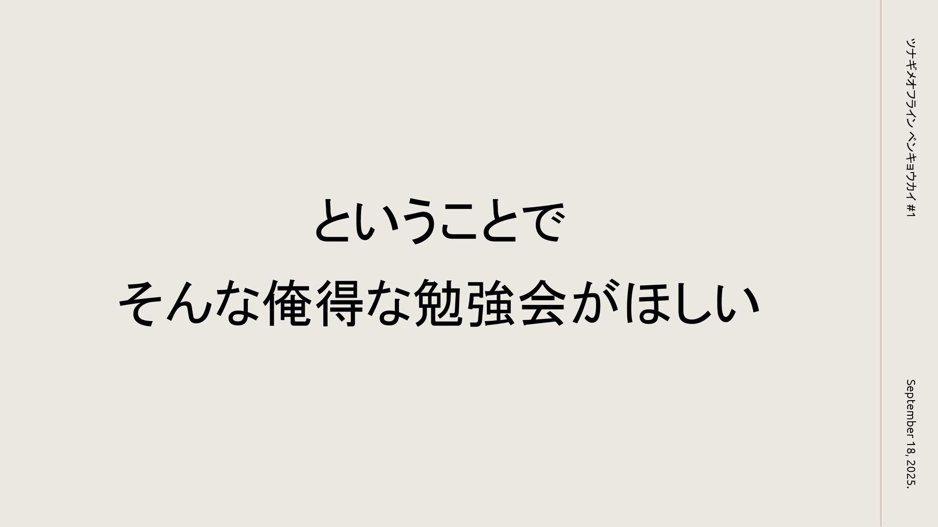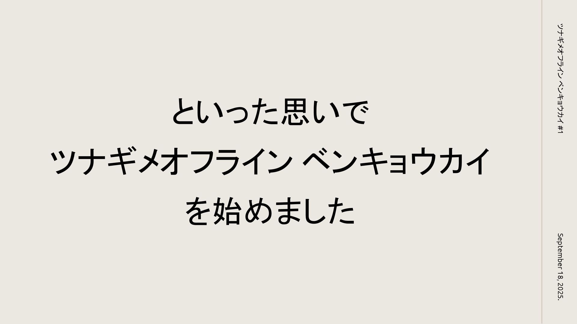 といった思いで ツナギメオフライン ベンキョウカイ を始めました September 18, 2025. ツナギメオフライン ベンキョウカイ #1