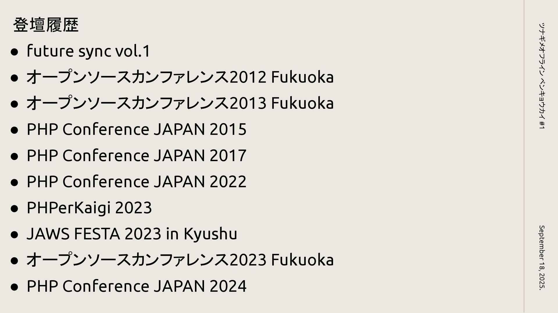 Fukuoka • PHP Conference JAPAN 2015 • PHP Conference JAPAN 2017 • PHP Conference JAPAN 2022 • PHPerKaigi 2023 • JAWS FESTA 2023 in Kyushu • オープンソースカンファレンス2023 Fukuoka • PHP Conference JAPAN 2024 September 18, 2025. ツナギメオフライン ベンキョウカイ #1
