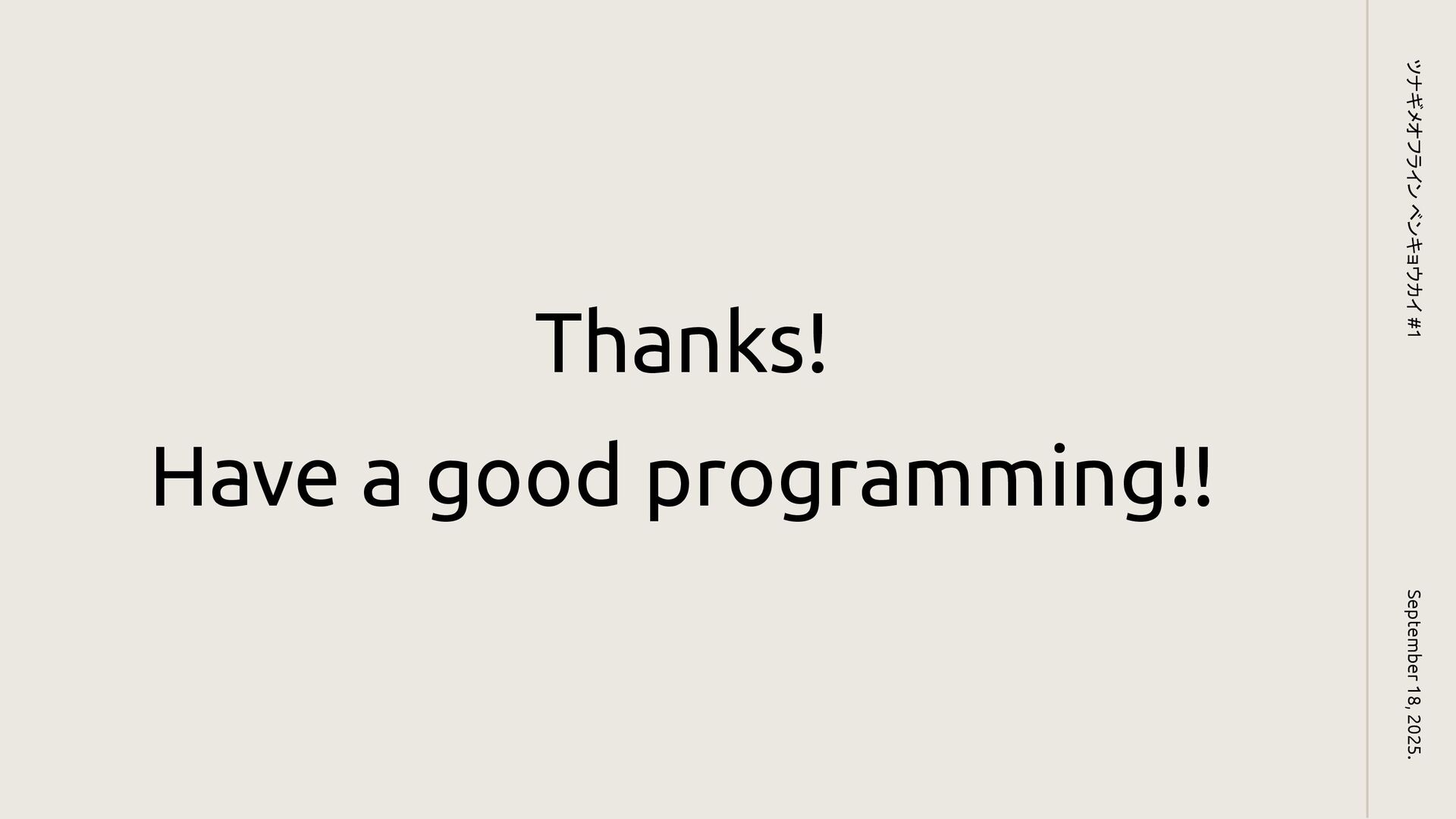 Thanks! Have a good programming!! September 18, 2025. ツナギメオフライン ベンキョウカイ