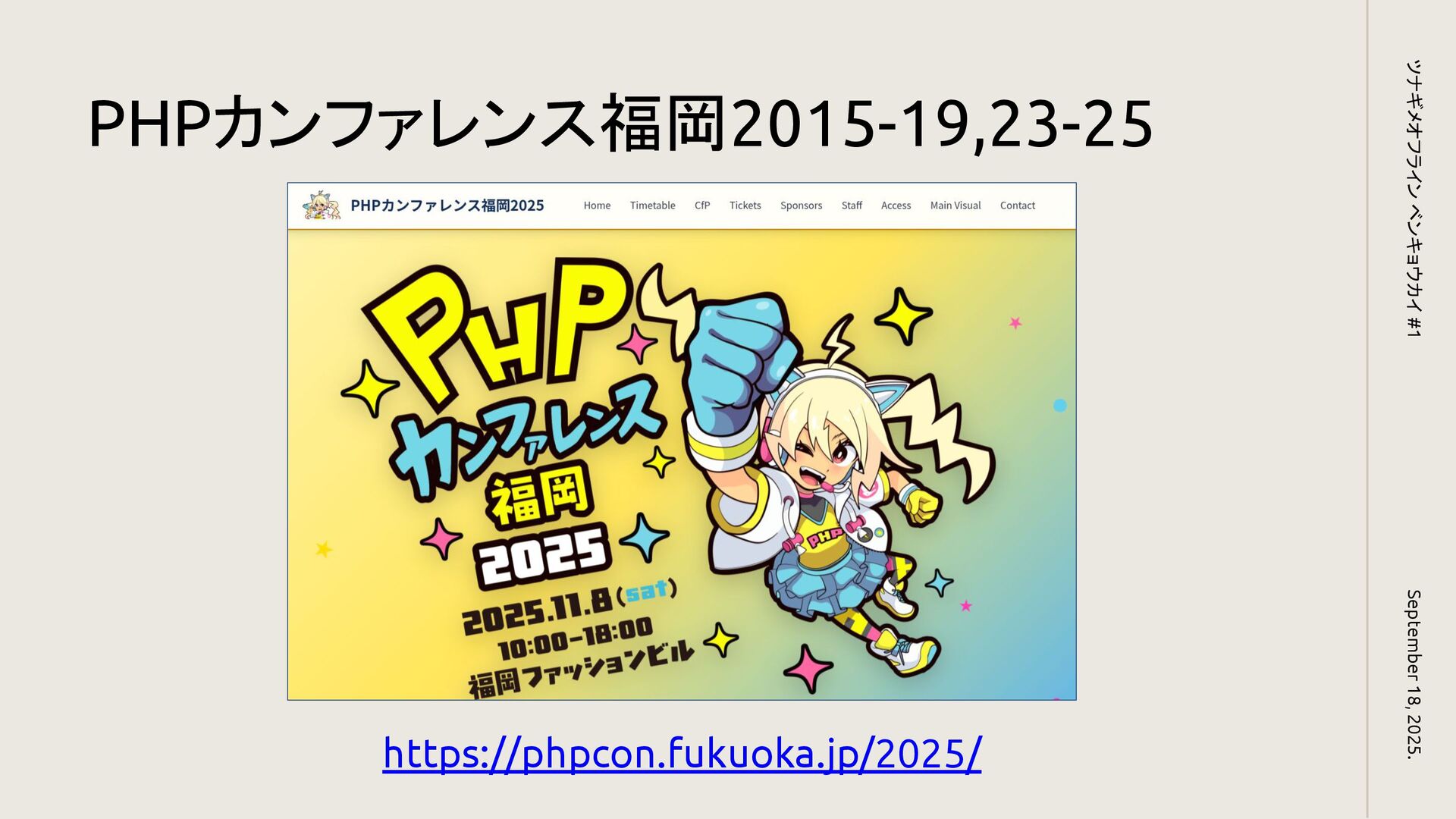 PHPカンファレンス福岡2015-19,23-25 https://phpcon.fukuoka.jp/2025/ September 18, 2025. ツナギメオフライン ベンキョウカイ #1