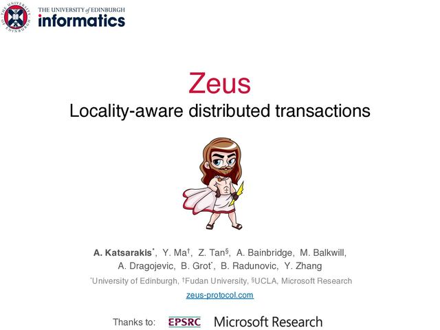A. Bainbridge, M. Balkwill, A. Dragojevic, B. Grot*, B. Radunovic, Y. Zhang *University of Edinburgh, †Fudan University, §UCLA, Microsoft Research zeus-protocol.com Thanks to: