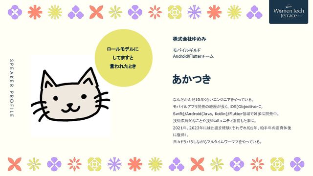 F I L E モバイルギルド Android/Flutterチーム あかつき 株式会社ゆめみ なんだかんだ10年くらいエンジニアをやっている。 モバイルアプリ開発の経歴が長く、iOS(Objective-C, Swift)/Android(Java, Kotlin)/Flutter領域で雑多に開発中。 技術広報的なことや技術コミュニティ運営もたまに。 2021年、2023年には出産を経験(それぞれ約1年、約半年の産育休後 に復帰)。 日々ドタバタしながらフルタイムワーママをやっている。 ロールモデルに してますと 言われたとき