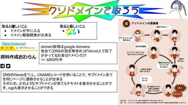 取ると嬉しいこと • ドメインが手に入る • ドメイン駆動開発が出来る 取ると悲しいこと • https://owa.run domain取得はgoogle domains
