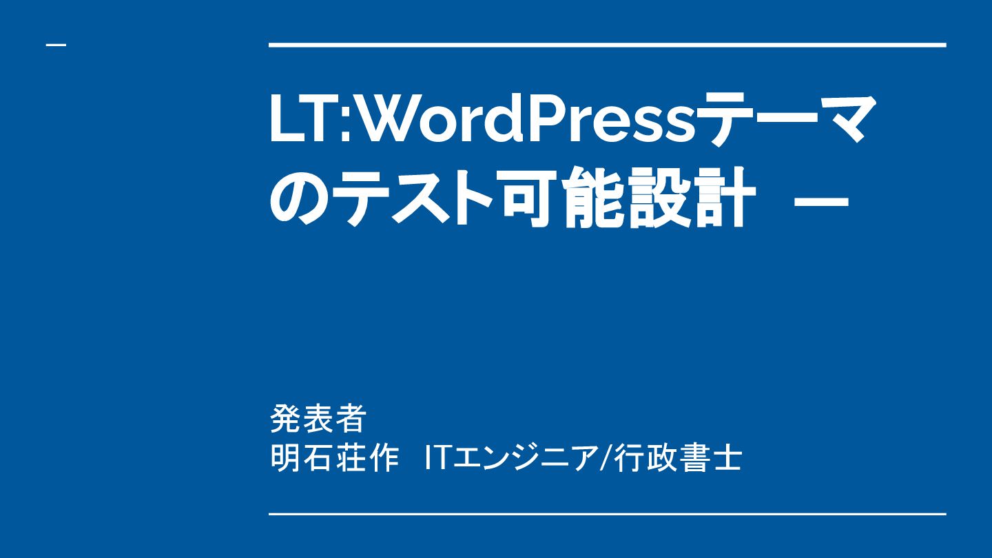 LT:WordPressテーマ のテスト可能設計 — 発表者 明石荘作 ITエンジニア/行政書士