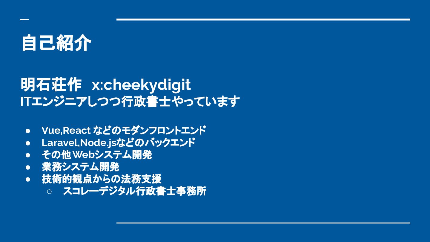 自己紹介 明石荘作 x:cheekydigit ITエンジニアしつつ行政書士やっています • Vue,React などのモダンフロントエンド • Laravel,Node.jsなどのバックエンド •