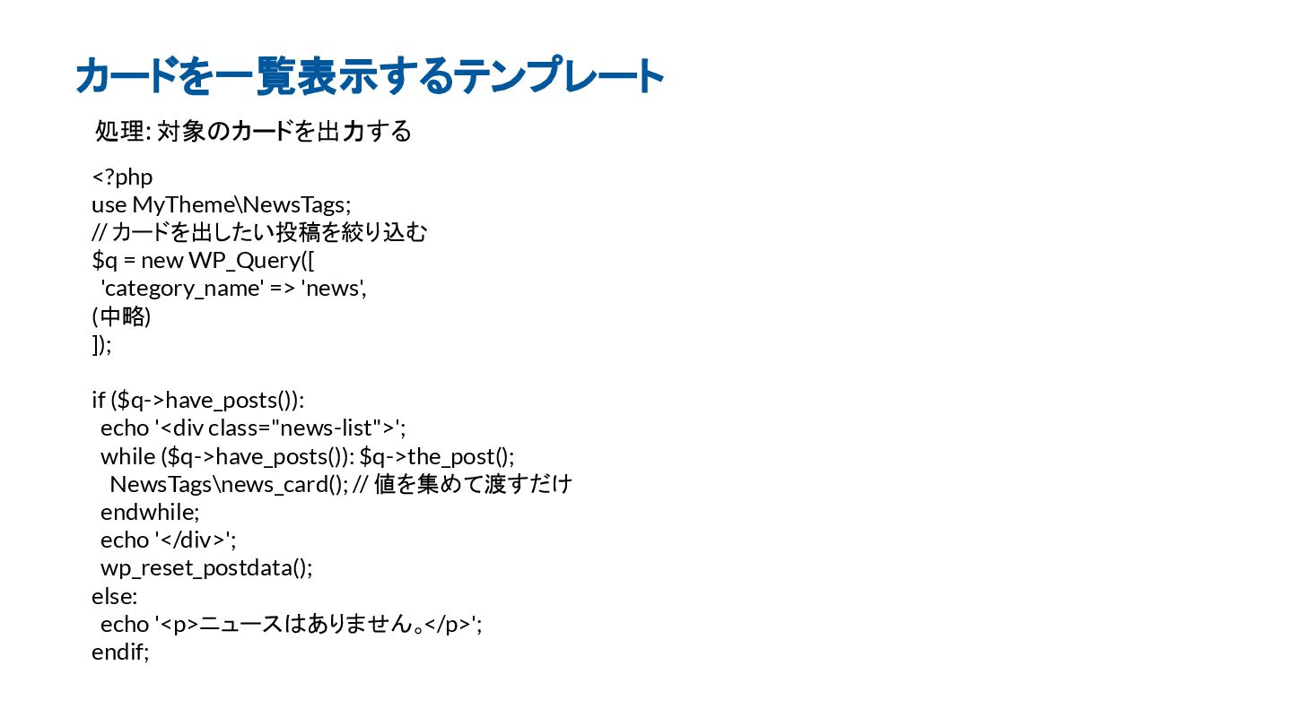 処理: 対象のカードを出力する カードを一覧表示するテンプレート <?php use MyTheme\NewsTags; // カードを出したい投稿を絞り込む $q =