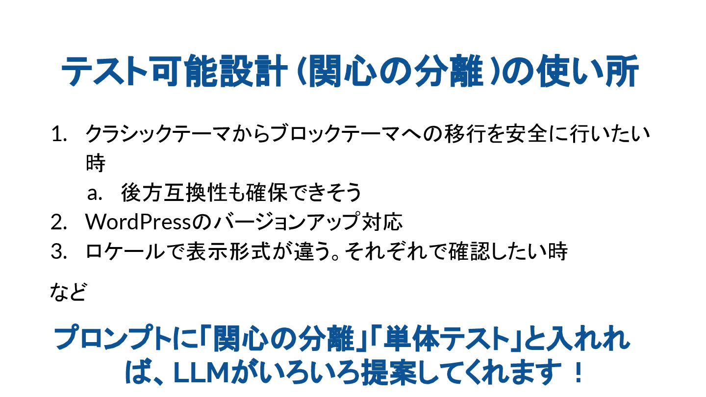 テスト可能設計 (関心の分離 )の使い所 1. クラシックテーマからブロックテーマへの移行を安全に行いたい 時 a. 後方互換性も確保できそう 2. WordPressのバージョンアップ対応