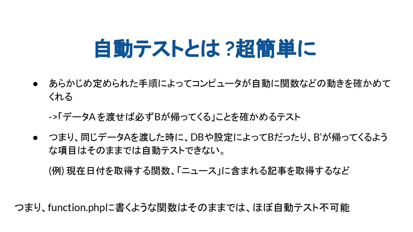 (例) 現在日付を取得する関数、「ニュース」に含まれる記事を取得するなど つまり、function.phpに書くような関数はそのままでは、ほぼ自動テスト不可能