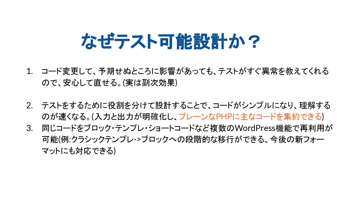 なぜテスト可能設計か? 1. コード変更して、予期せぬところに影響があっても、テストがすぐ異常を教えてくれる ので、安心して直せる。(実は副次効果) 2. テストをするために役割を分けて設計することで、コードがシンプルになり、理解する のが速くなる。(入力と出力が明確化し、プレーンなPHPに主なコードを集約できる) 3. 同じコードをブロック・テンプレ・ショートコードなど複数のWordPress機能で再利用が 可能(例:クラシックテンプレ->ブロックへの段階的な移行ができる、今後の新フォー