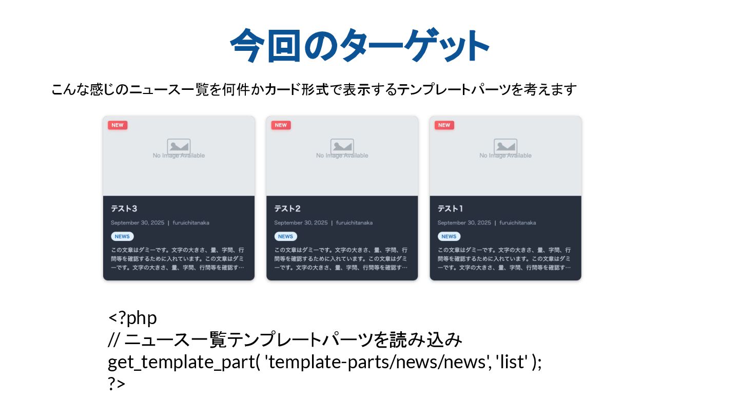 今回のターゲット こんな感じのニュース一覧を何件かカード形式で表示するテンプレートパーツを考えます <?php // ニュース一覧テンプレートパーツを読み込み get_template_part( 'template-parts/news/news', 'list' ); ?>
