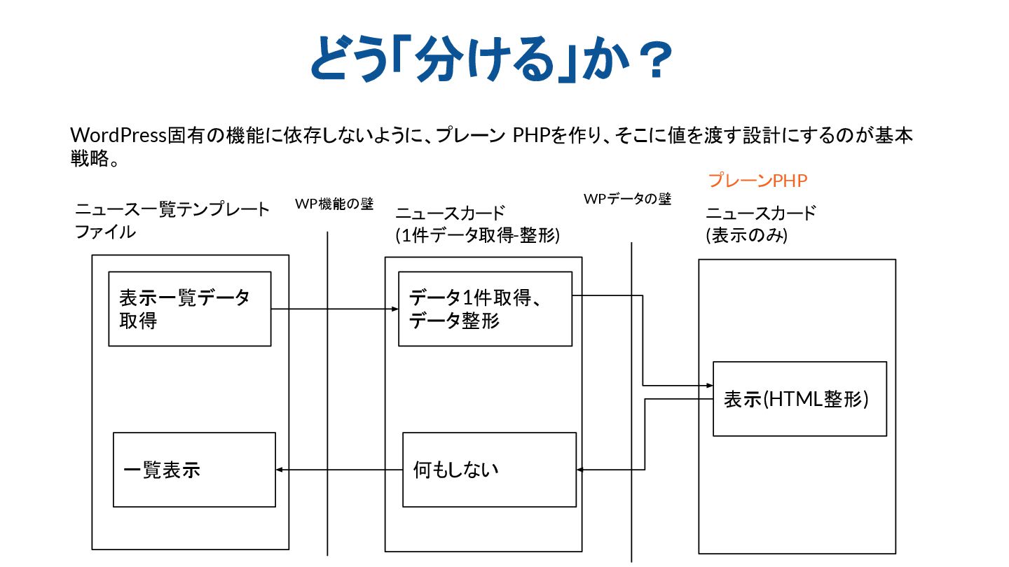 どう「分ける」か? WordPress固有の機能に依存しないように、プレーン PHPを作り、そこに値を渡す設計にするのが基本 戦略。 ニュース一覧テンプレート ファイル ニュースカード (1件データ取得-整形) ニュースカード (表示のみ)