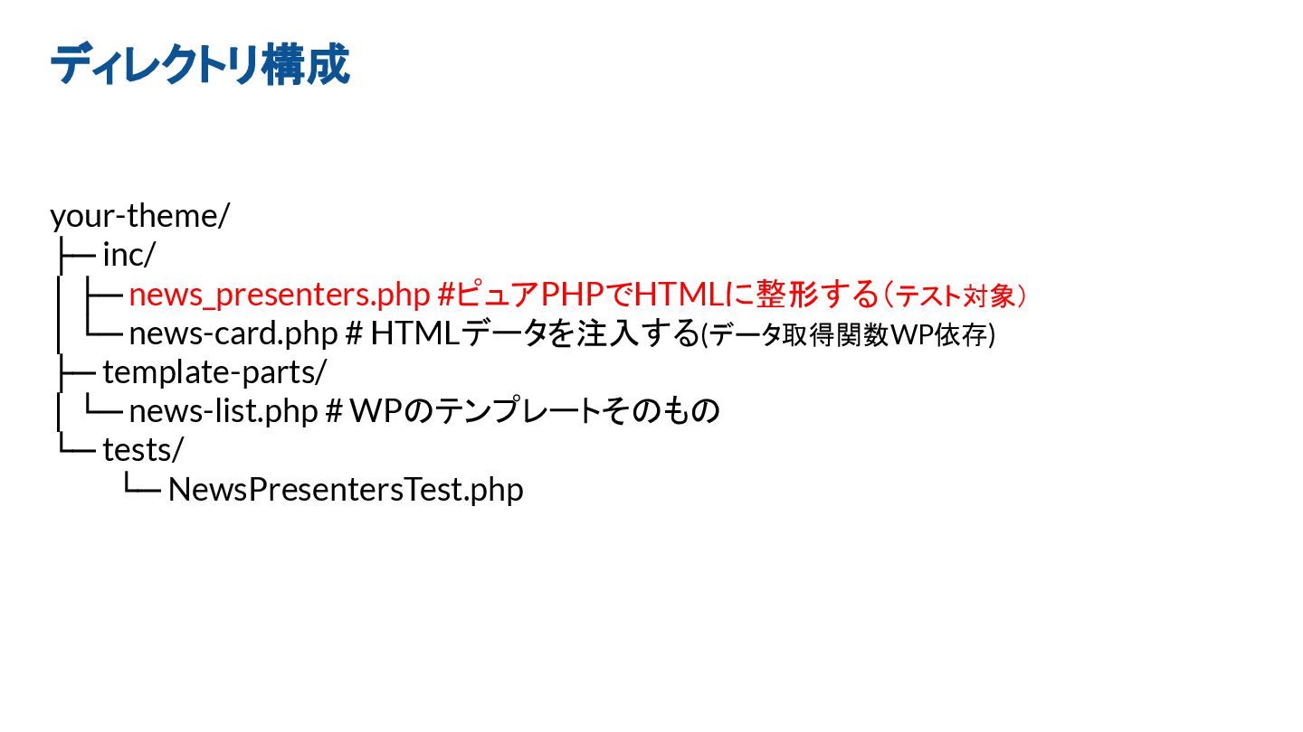 ディレクトリ構成 your-theme/ ├─ inc/ │ ├─ news_presenters.php #ピュアPHPでHTMLに整形する(テスト対象) │ └─