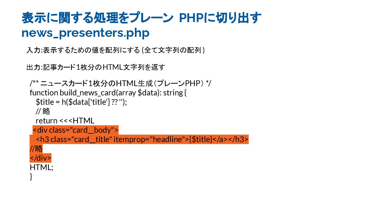 表示に関する処理をプレーン PHPに切り出す news_presenters.php 入力:表示するための値を配列にする (全て文字列の配列) 出力:記事カード1枚分のHTML文字列を返す /** ニュースカード1枚分のHTML生成(プレーンPHP) */ function