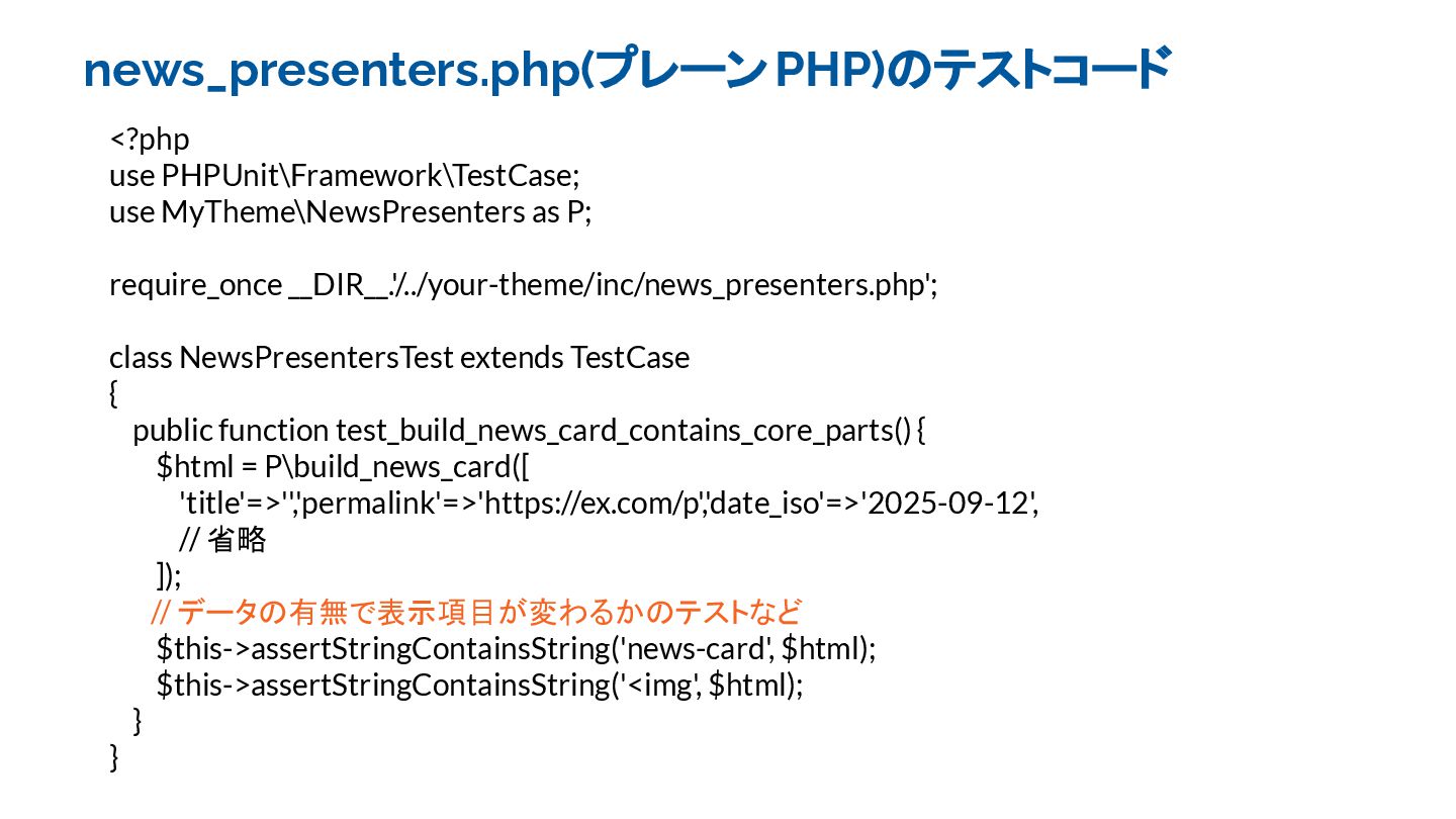 news_presenters.php(プレーンPHP)のテストコード <?php use PHPUnit\Framework\TestCase; use MyTheme\NewsPresenters as P; require_once __DIR__.'/../your-theme/inc/news_presenters.php';