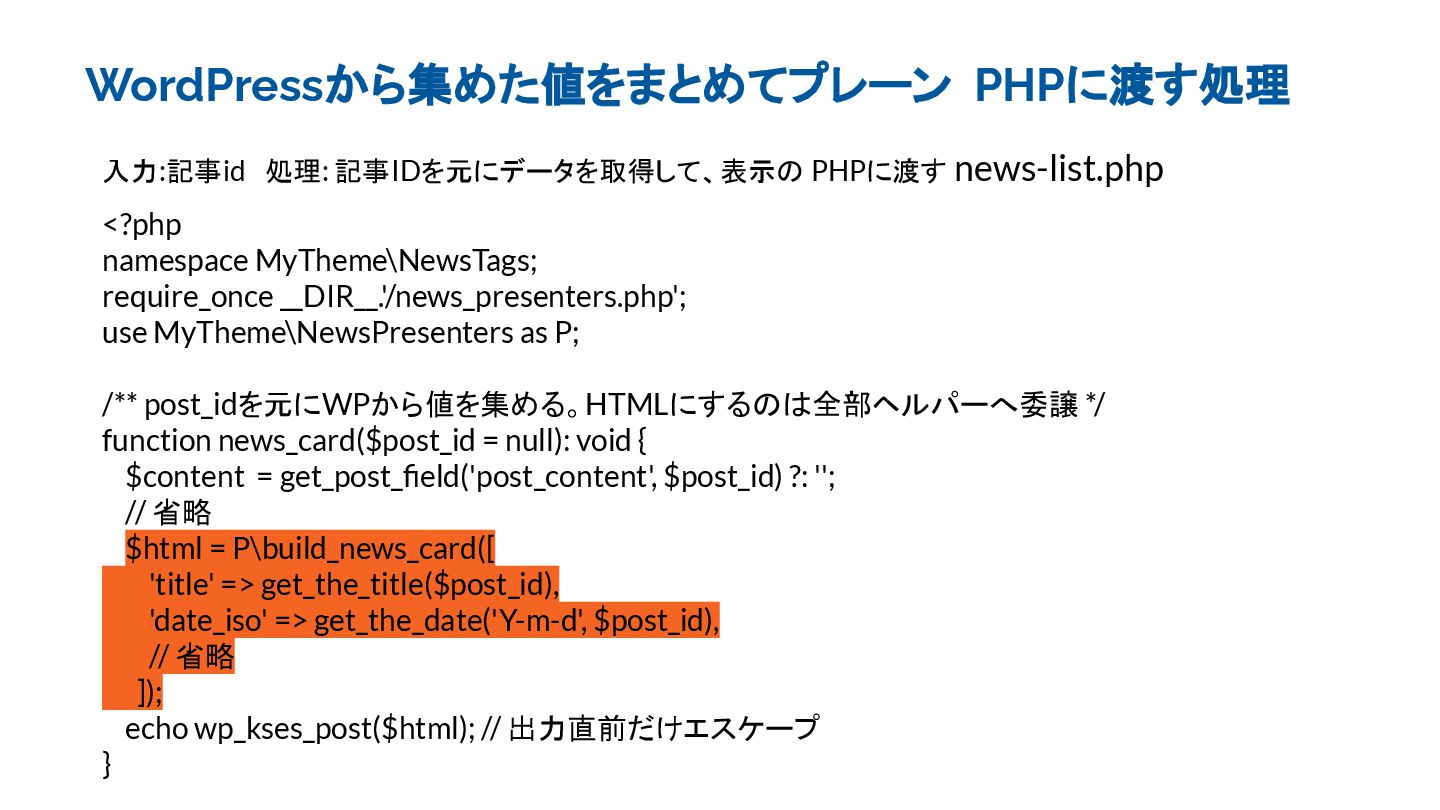 __DIR__.'/news_presenters.php'; use MyTheme\NewsPresenters as P; /** post_idを元にWPから値を集める。HTMLにするのは全部ヘルパーへ委譲 */ function news_card($post_id = null): void { $content = get_post_field('post_content', $post_id) ?: ''; // 省略 $html = P\build_news_card([ 'title' => get_the_title($post_id), 'date_iso' => get_the_date('Y-m-d', $post_id), // 省略 ]); echo wp_kses_post($html); // 出力直前だけエスケープ }