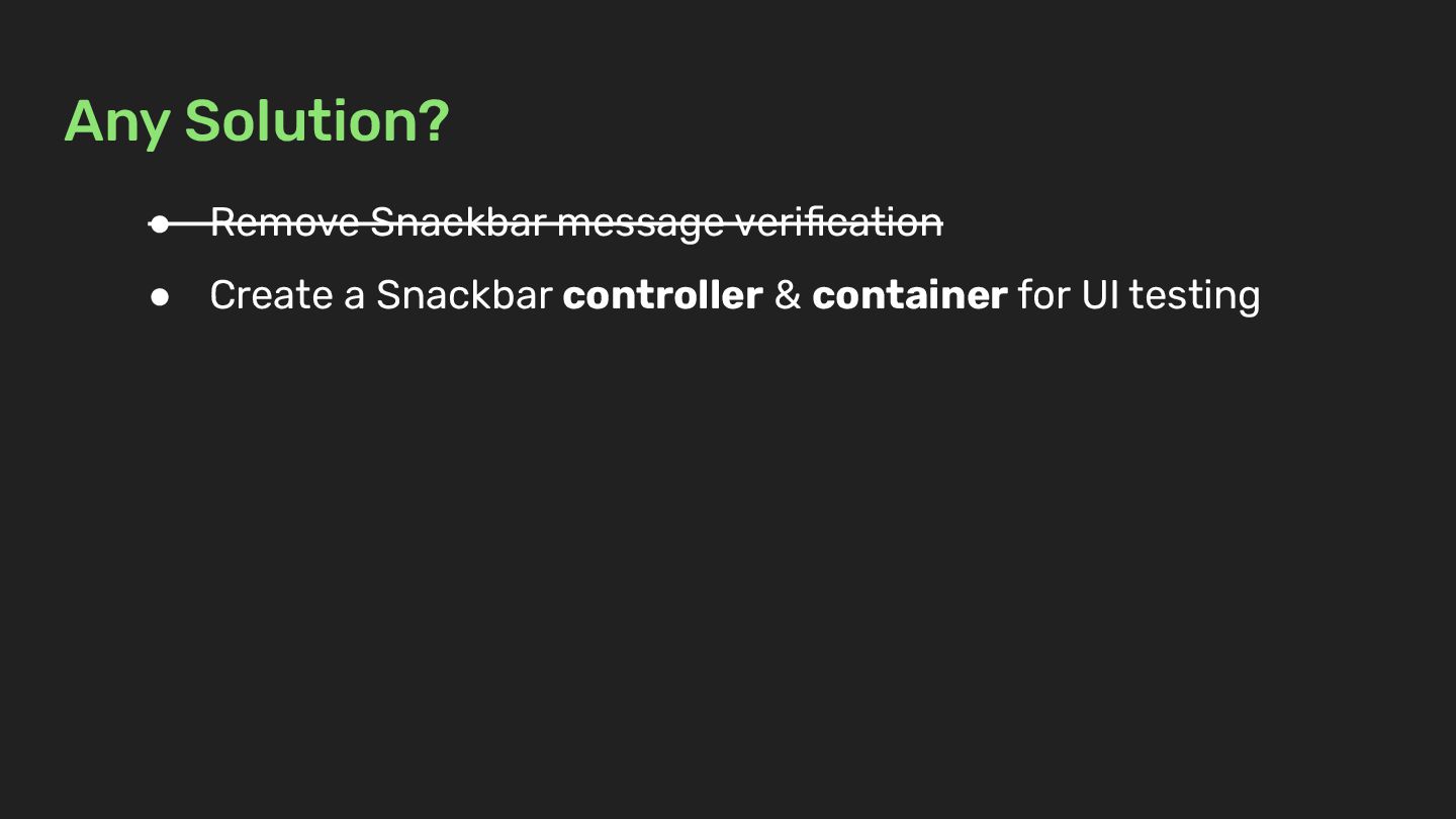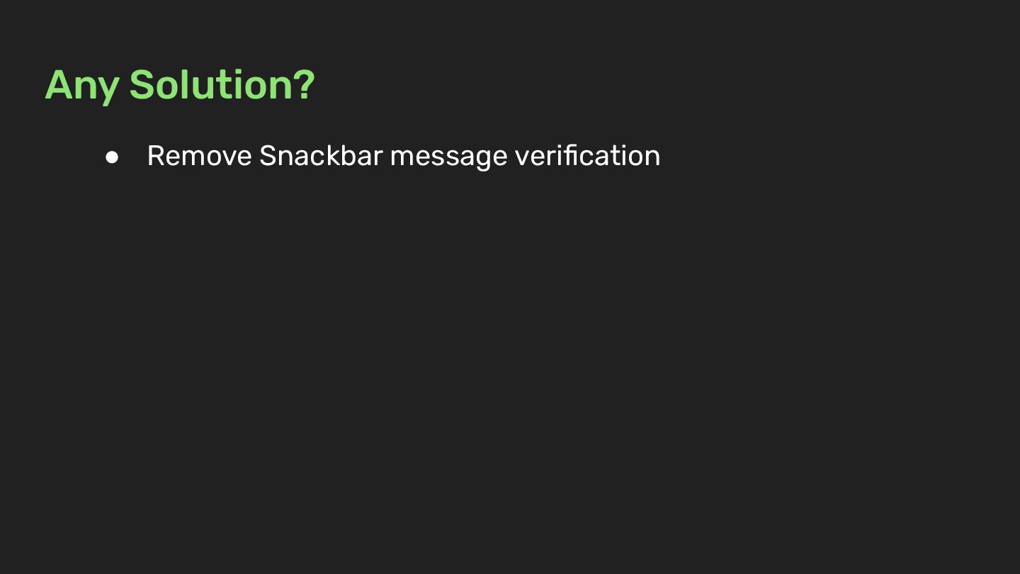 Any Solution? • Remove Snackbar message verification • Create a