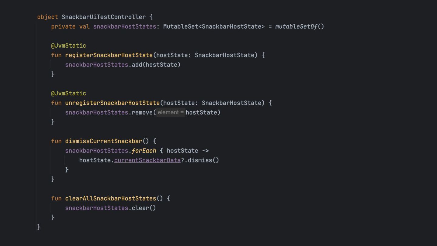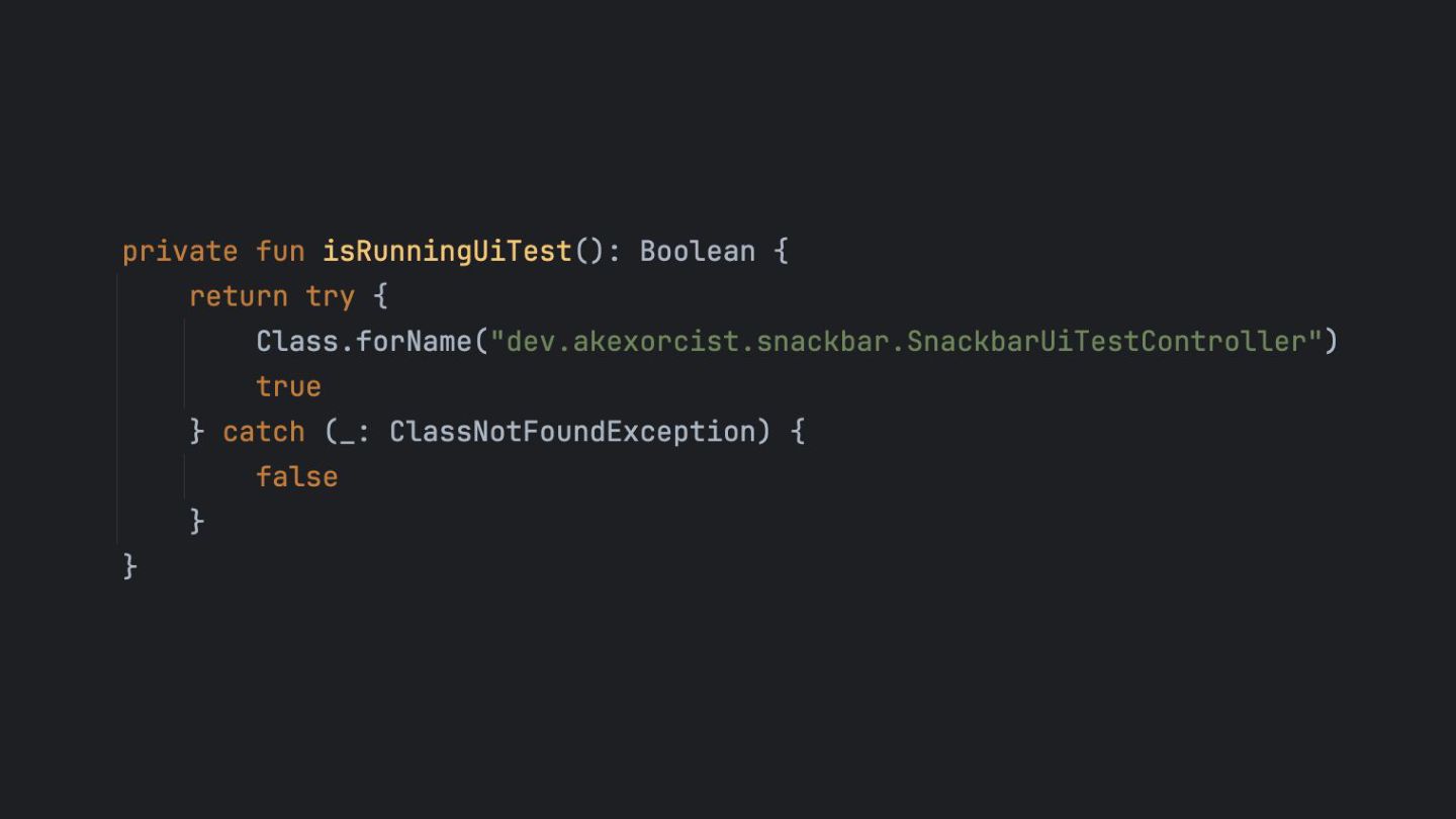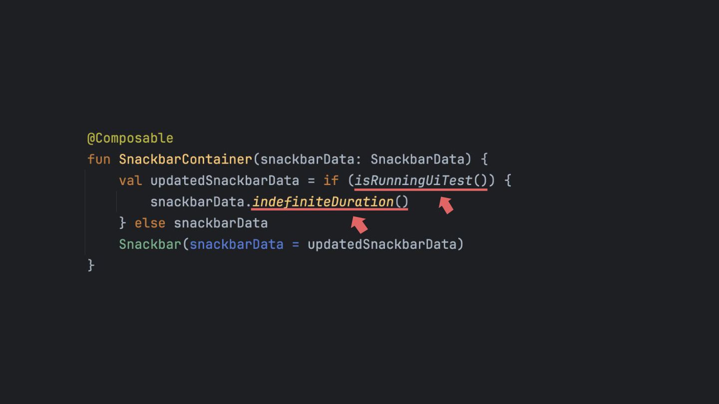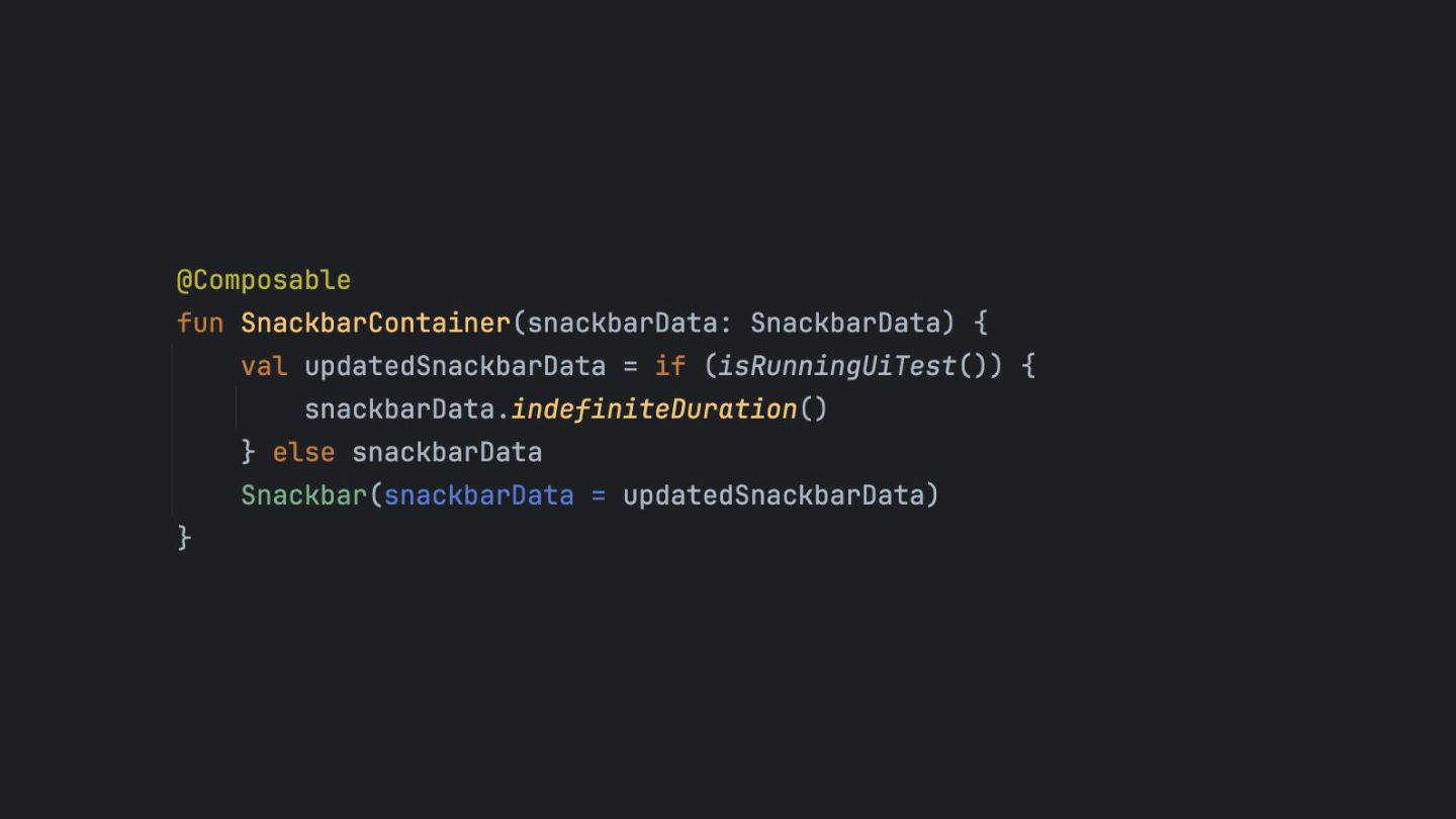 that's created while the app is running, so it can be dismissed in a UI test. Inject the SnackbarHostState into the SnackbarUiTestController using Java Reflection Override the duration to be indefinite when running under UI test. main main