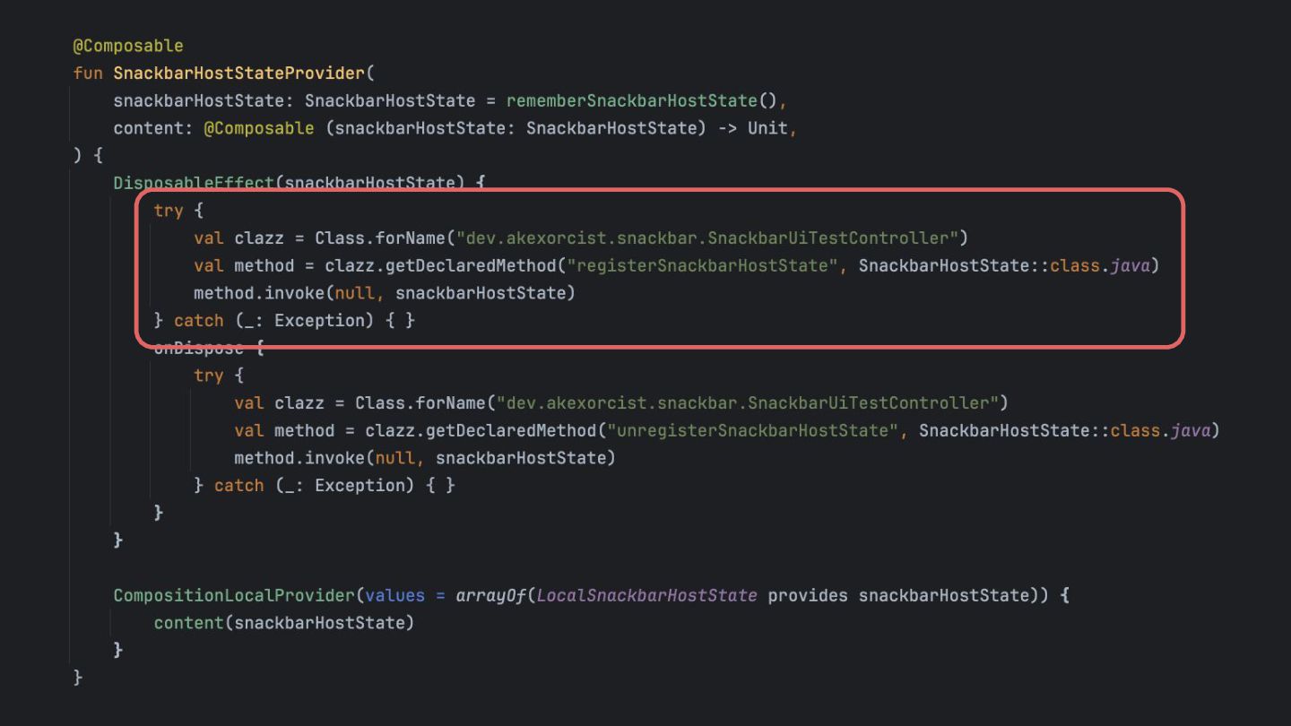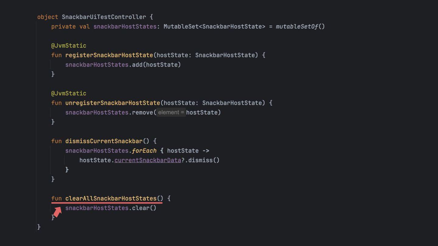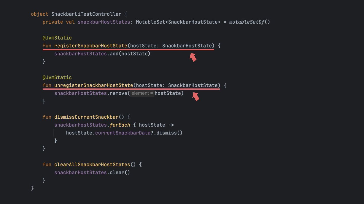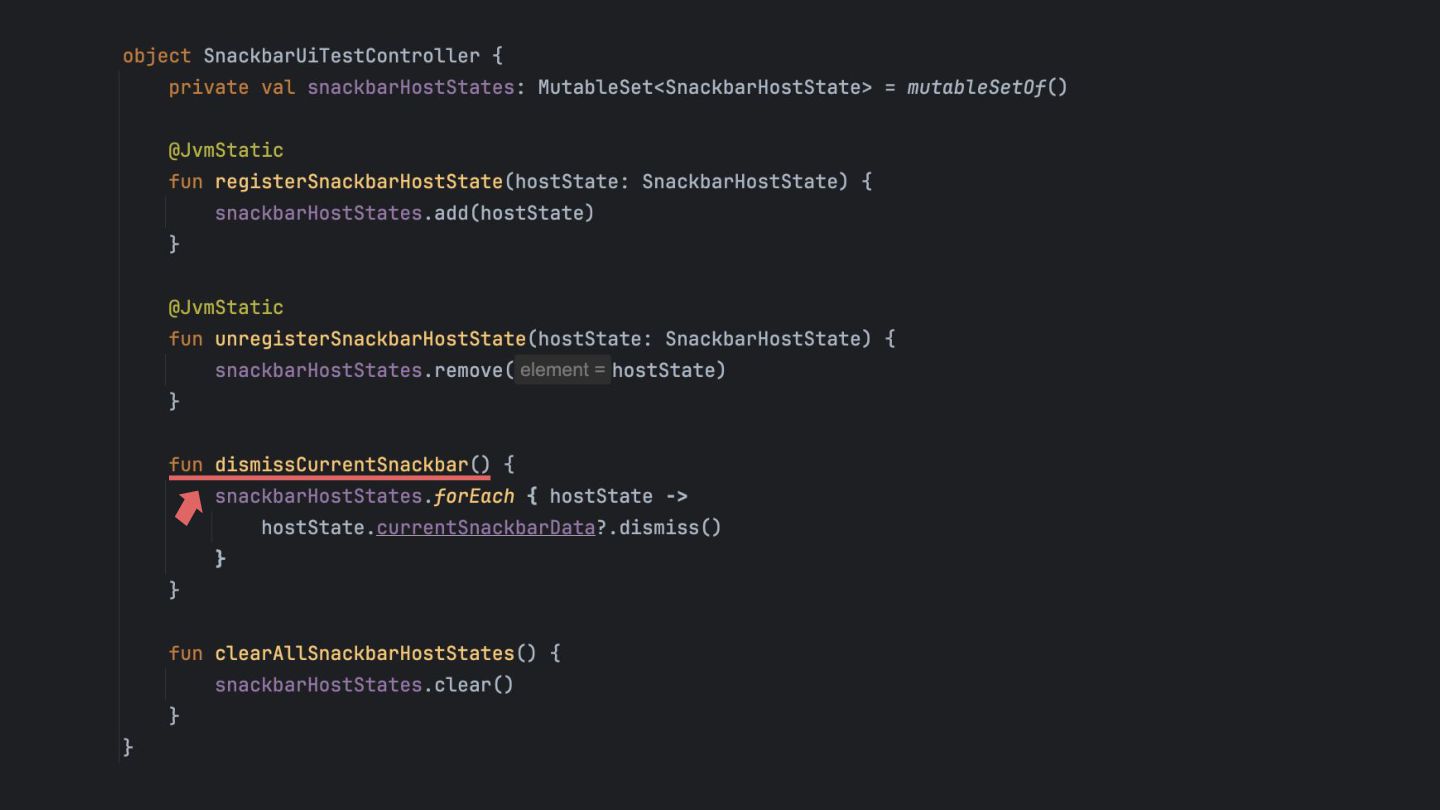 that's created while the app is running, so it can be dismissed in a UI test. Inject the SnackbarHostState into the SnackbarUiTestController using Java Reflection Override the duration to be indefinite when running under UI test. main main
