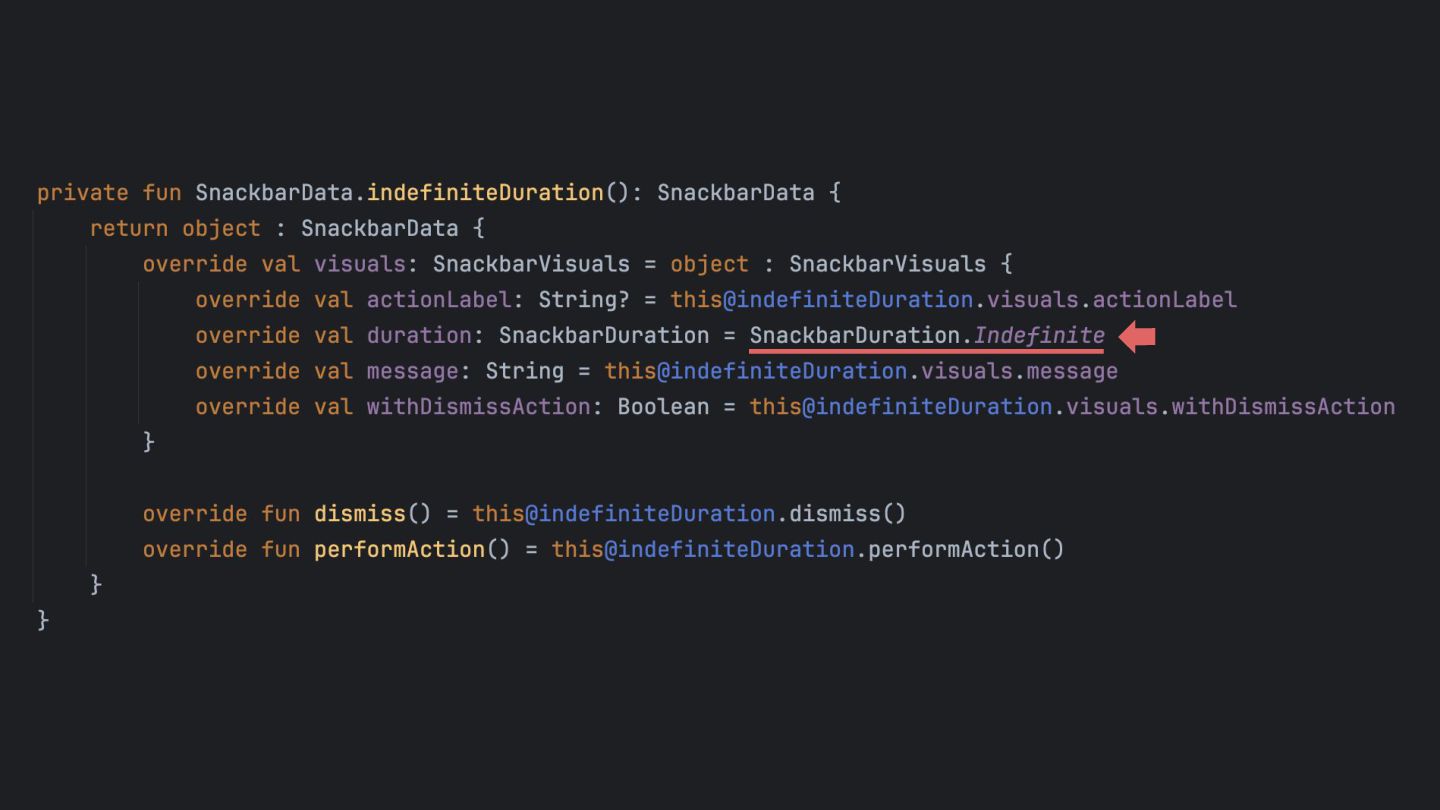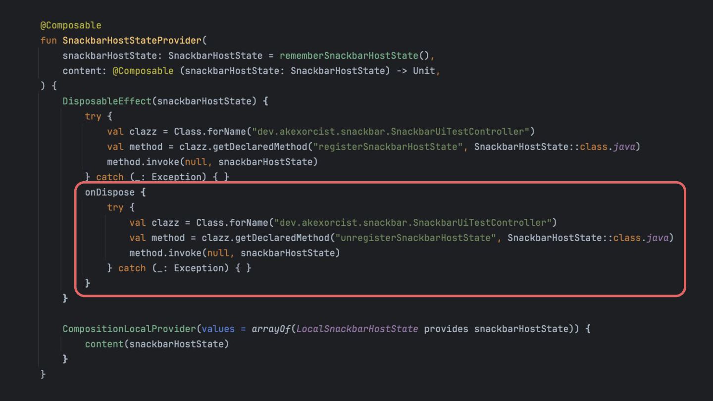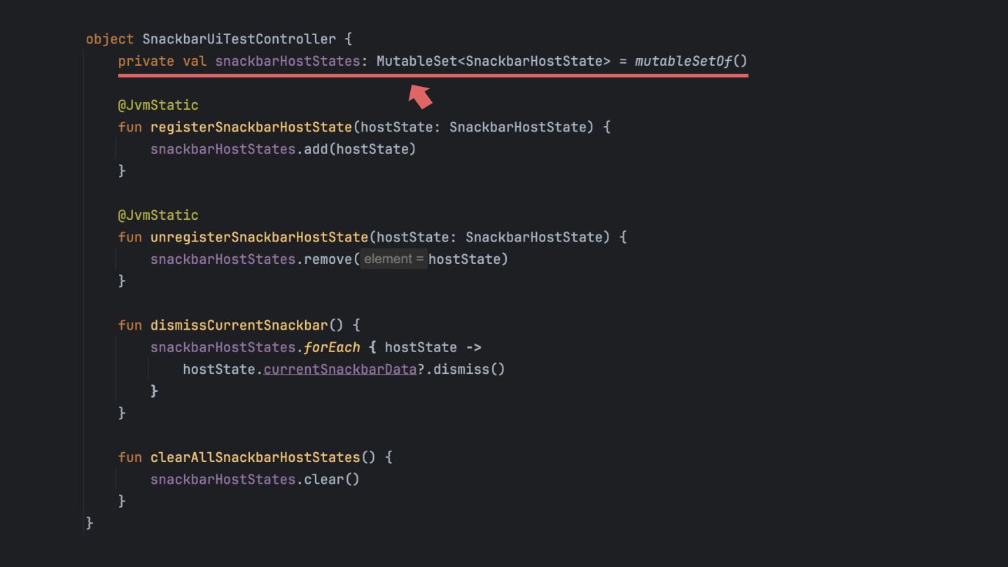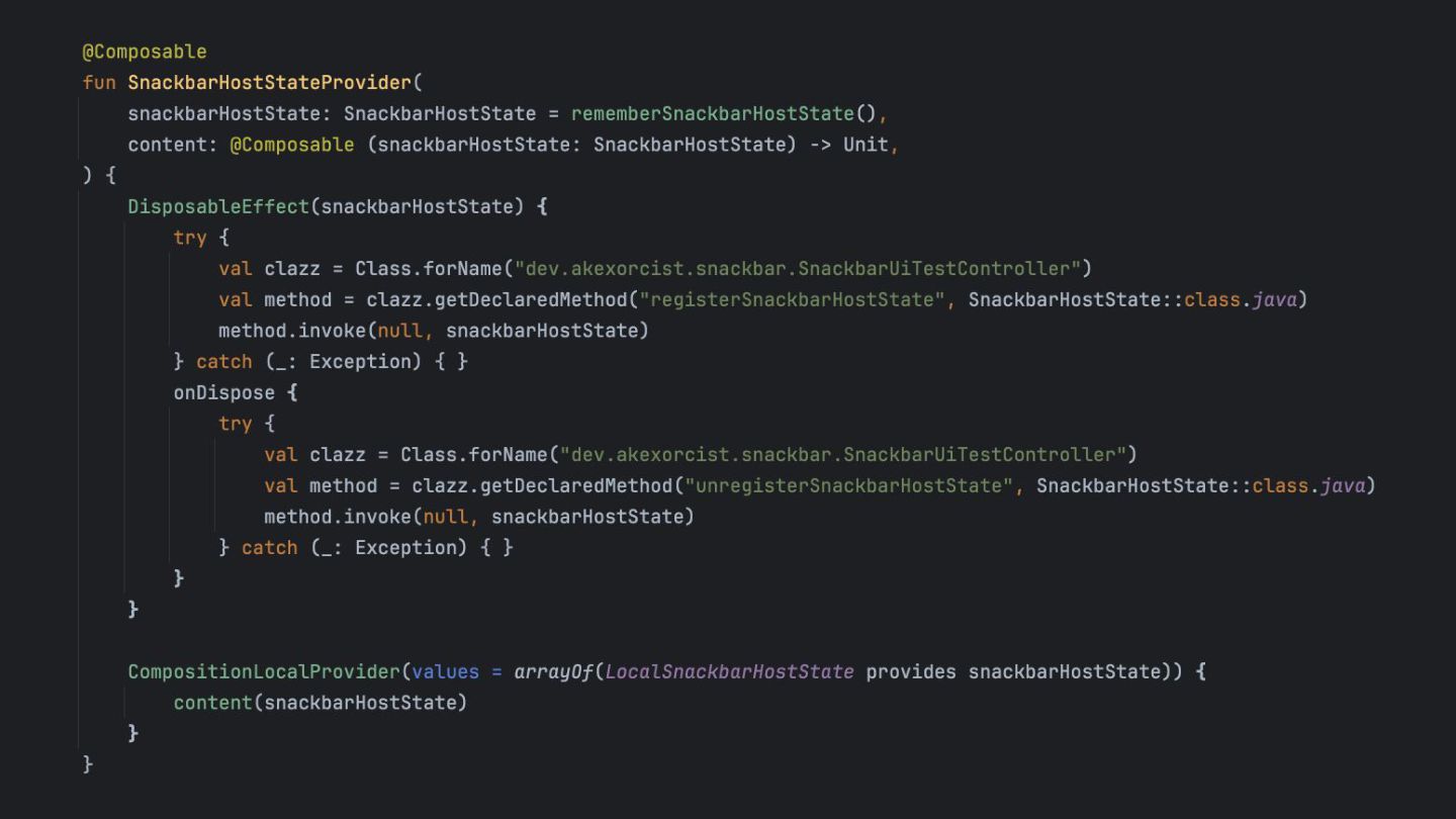 that's created while the app is running, so it can be dismissed in a UI test. Inject the SnackbarHostState into the SnackbarUiTestController using Java Reflection Override the duration to be indefinite when running under UI test. main main