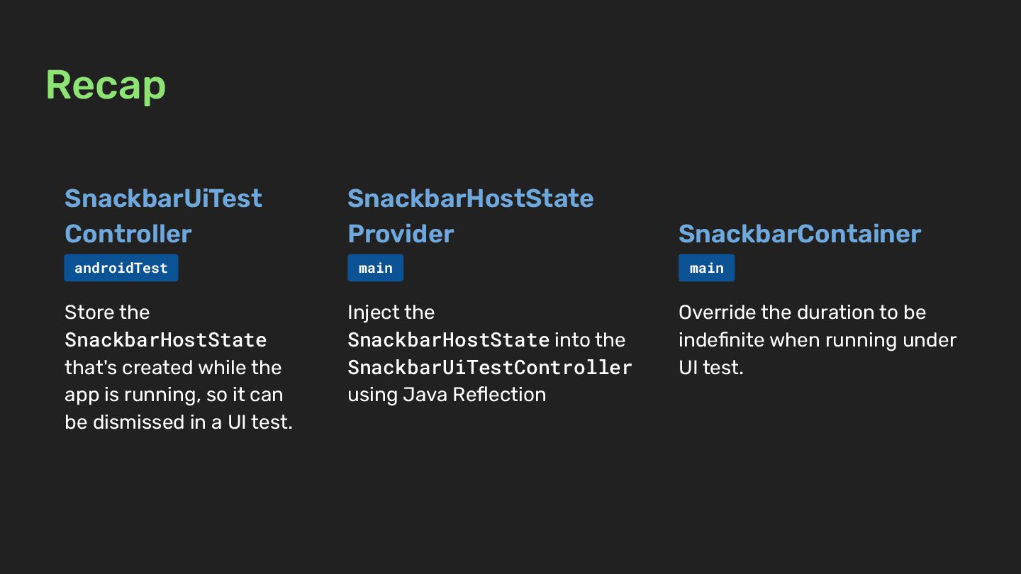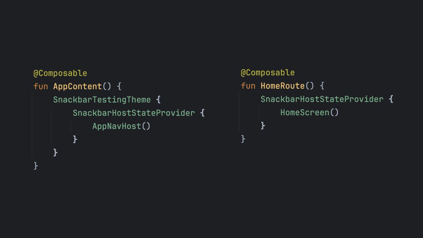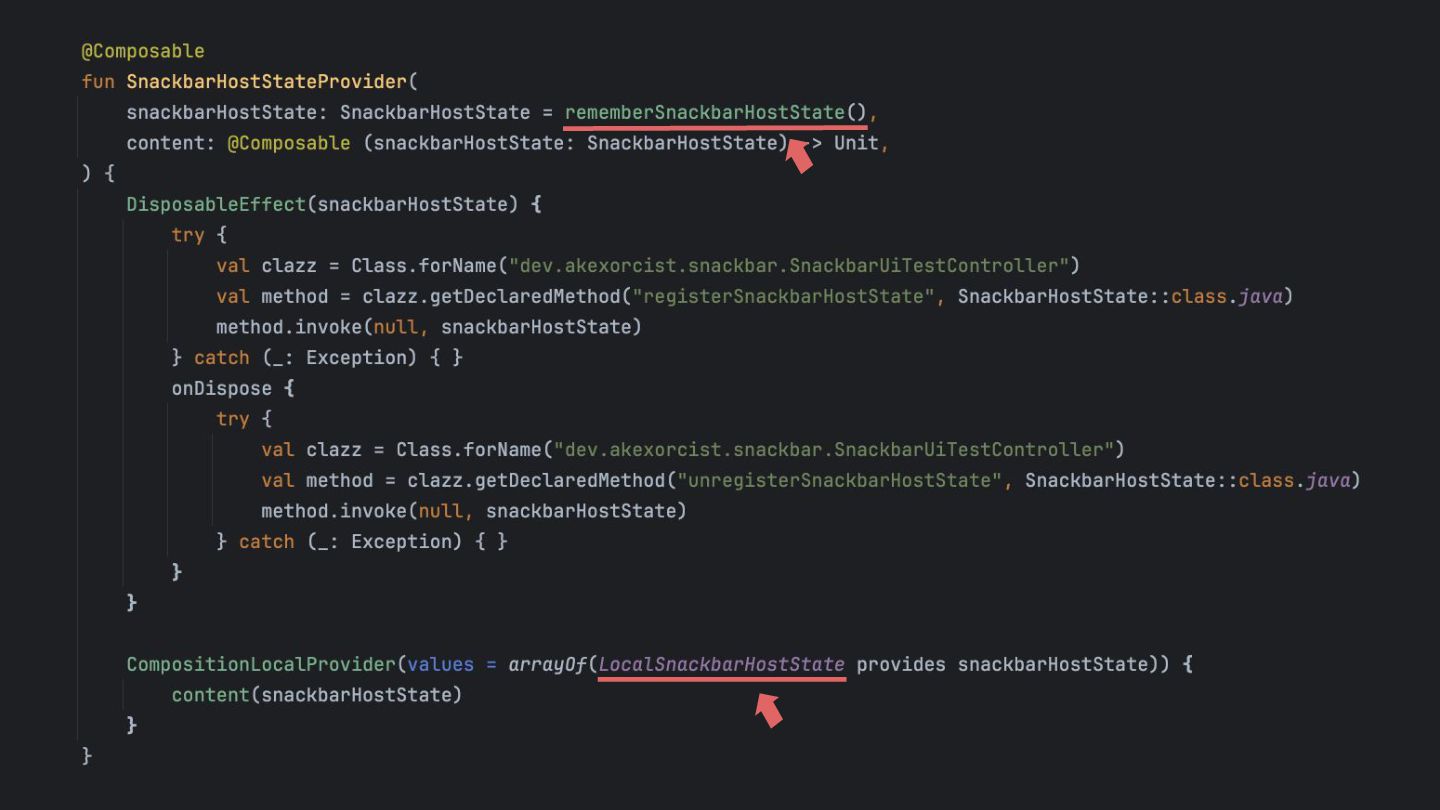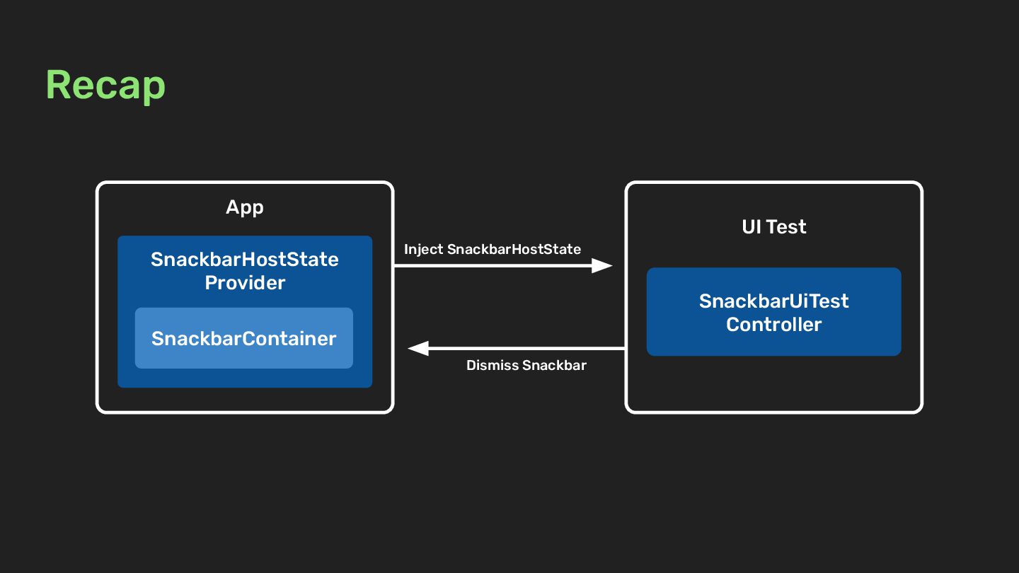 SnackbarContainer Recap SnackbarUiTest Controller SnackbarHostState Provider androidTest Store the SnackbarHostState