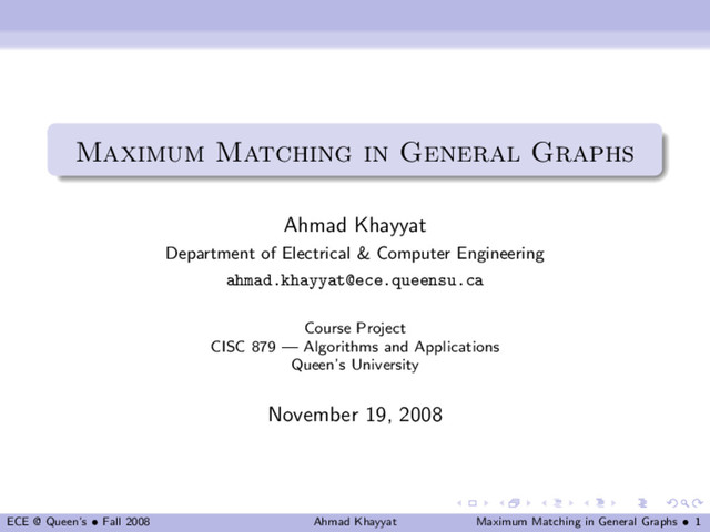 Berge proposed constructing a maximum matching by exhaustively searching for augmenting paths, which Edmonds argues is of exponential order. Edmonds then proposed the first polynomial time maximum matching algorithm using the same augmenting path method. His algorithm is O(n 4 ). Gabow then proposed a “careful implementation” of Edmonds algorithm that improves the algorithm time to O(n 3 ). Vazirani, Blum, and Gabow used different techniques to achieve the best known algorithms for solving the maximum matching problem for general non-bipartite graphs. The three algorithms are of complexity O(m n), which gives O(n 2.5) for dense graphs.