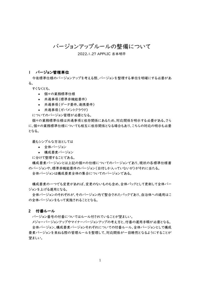 • 個々の業務標準仕様 • 共通事項(標準非機能要件) • 共通事項(データ要件、連携要件) • 共通事項(ガバメントクラウド) についてのバージョン管理が必要となる。 個々の業務標準仕様は共通事項と依存関係にあるため、対応関係を明示する必要がある。さら に、個々の業務標準仕様についても相互に依存関係となる場合もあり、こちらの対応の明示も必要 となる。 最もシンプルな方法としては • 全体バージョン • 構成要素バージョン に分けて整理することである。 構成要素バージョンとは上記の個々の仕様についてのバージョンであり、現状の各標準仕様書 のバージョンや、標準非機能要件のバージョン(日付しか入っていないが)がそれに当たる。 全体バージョンは構成要素全体の集合についてのバージョンである。 構成要素の一つでも変更があれば、変更のないものも含め、全体パックとして更新して全体バー ジョンを上げる運用となる。 全体バージョンのそれぞれが、そのバージョン内で整合されたパックであり、自治体への適用はこ の全体バージョンをもって実施されることとなる。 2 付番ルール バージョン番号の付番についてはルール付されていることが望ましい。 メジャーバージョンアップやマイナーバージョンアップの考え方と、付番の運用手順が必要となる。 全体バージョン、構成要素バージョンそれぞれについての付番ルール、全体バージョンとして構成 要素バージョンを束ねる際の管理ルールを整理して、対応関係が一目瞭然となるようにすることが 望ましい。