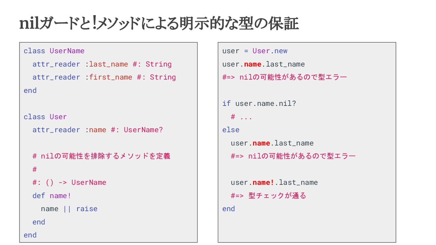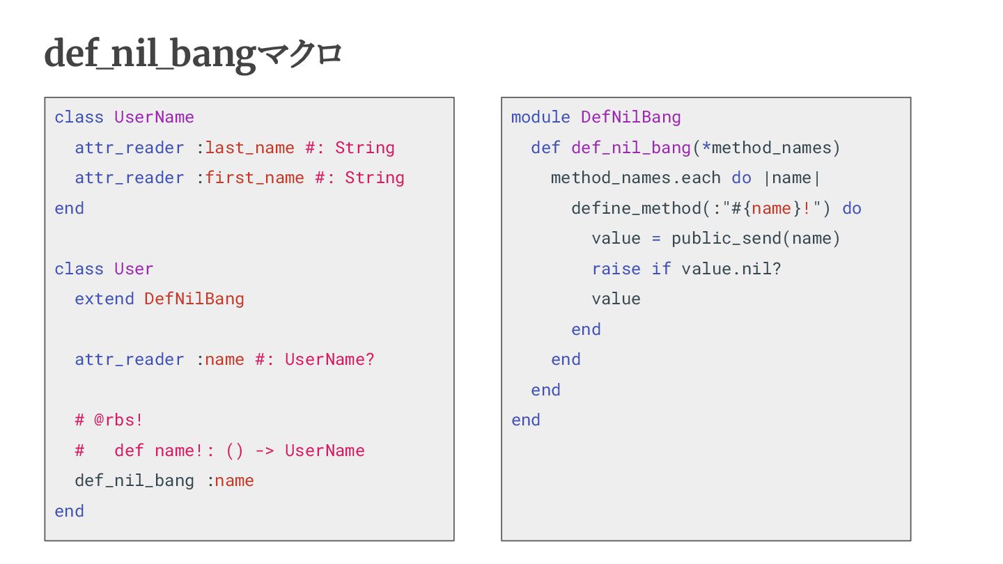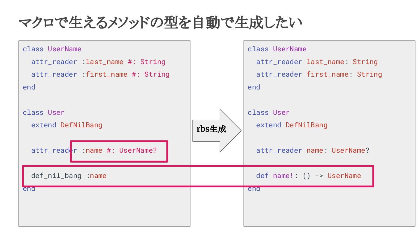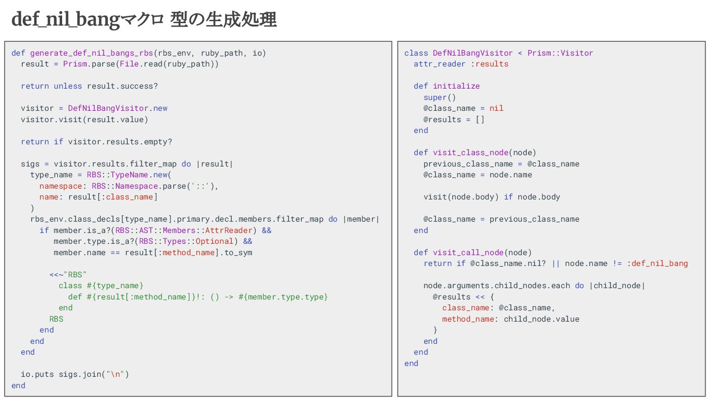 = nil @results = [] end def visit_class_node(node) previous_class_name = @class_name @class_name = node.name visit(node.body) if node.body @class_name = previous_class_name end def visit_call_node(node) return if @class_name.nil? || node.name != :def_nil_bang node.arguments.child_nodes.each do |child_node| @results << { class_name: @class_name, method_name: child_node.value } end end end def generate_def_nil_bangs_rbs(rbs_env, ruby_path, io) result = Prism.parse(File.read(ruby_path)) return unless result.success? visitor = DefNilBangVisitor.new visitor.visit(result.value) return if visitor.results.empty? sigs = visitor.results.filter_map do |result| type_name = RBS::TypeName.new( namespace: RBS::Namespace.parse('::'), name: result[:class_name] ) rbs_env.class_decls[type_name].primary.decl.members.filter_map do |member| if member.is_a?(RBS::AST::Members::AttrReader) && member.type.is_a?(RBS::Types::Optional) && member.name == result[:method_name].to_sym <<~"RBS" class #{type_name} def #{result[:method_name]}!: () -> #{member.type.type} end RBS end end end io.puts sigs.join("\n") end def_nil_bangマクロ 型の生成処理