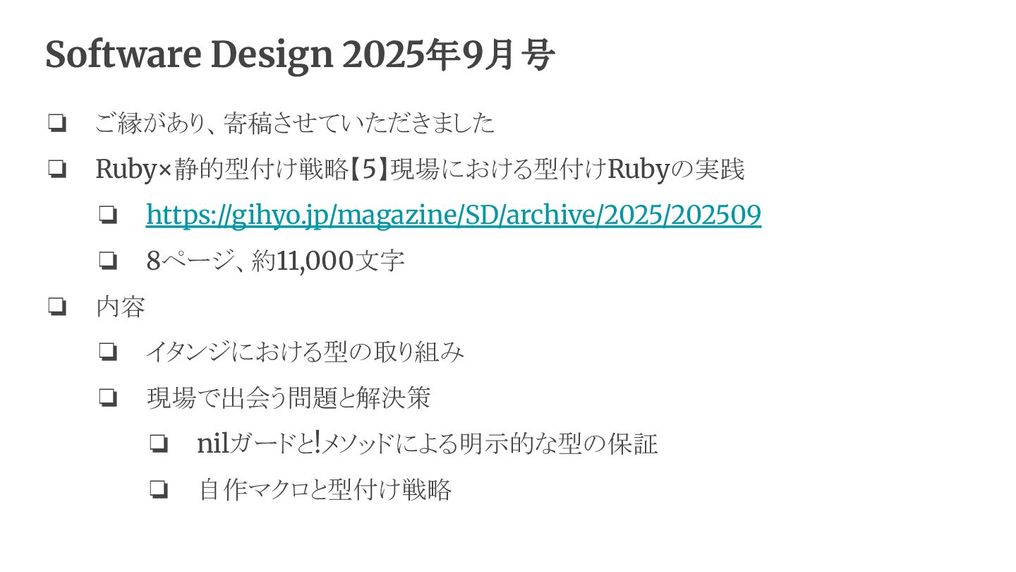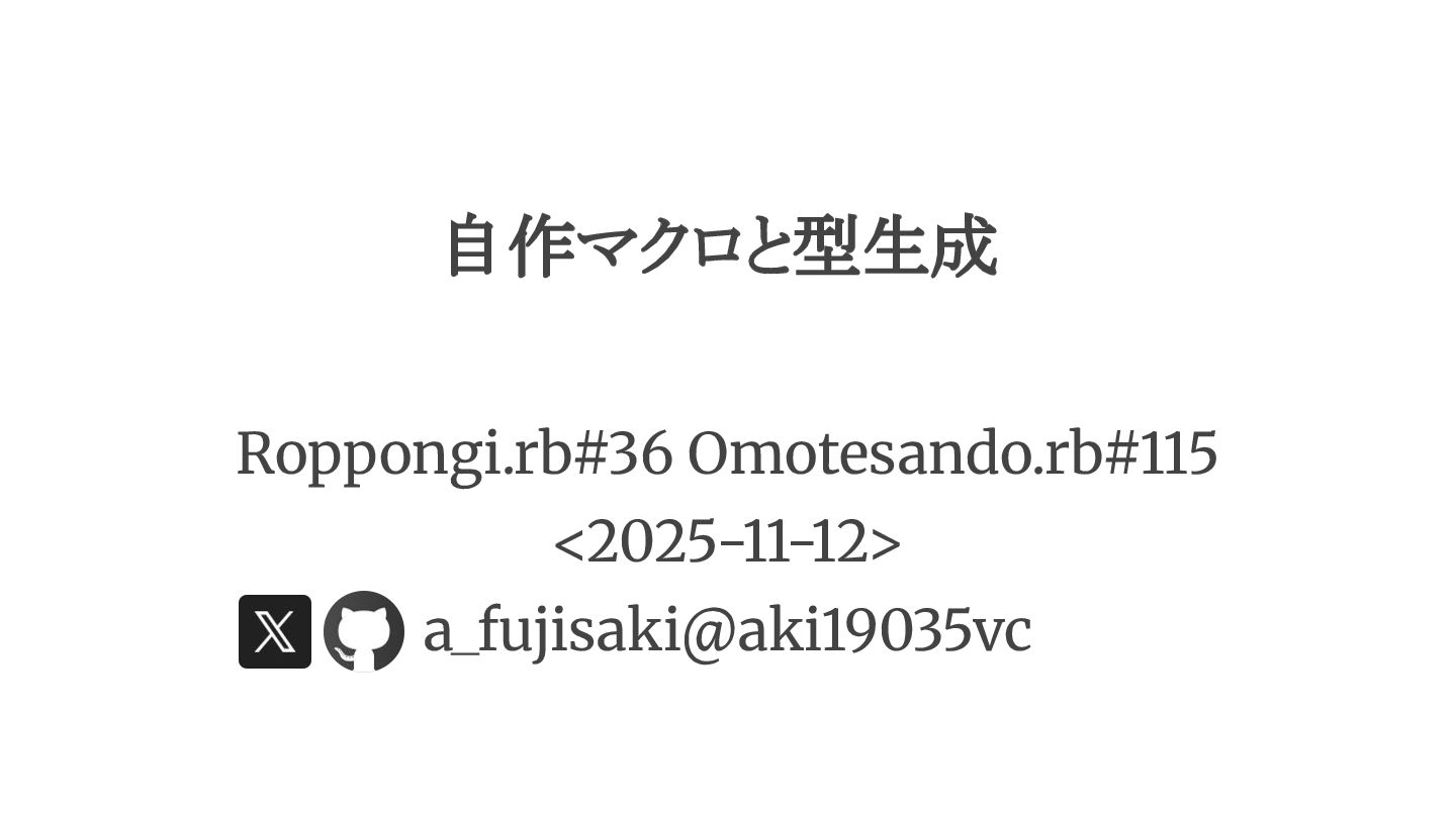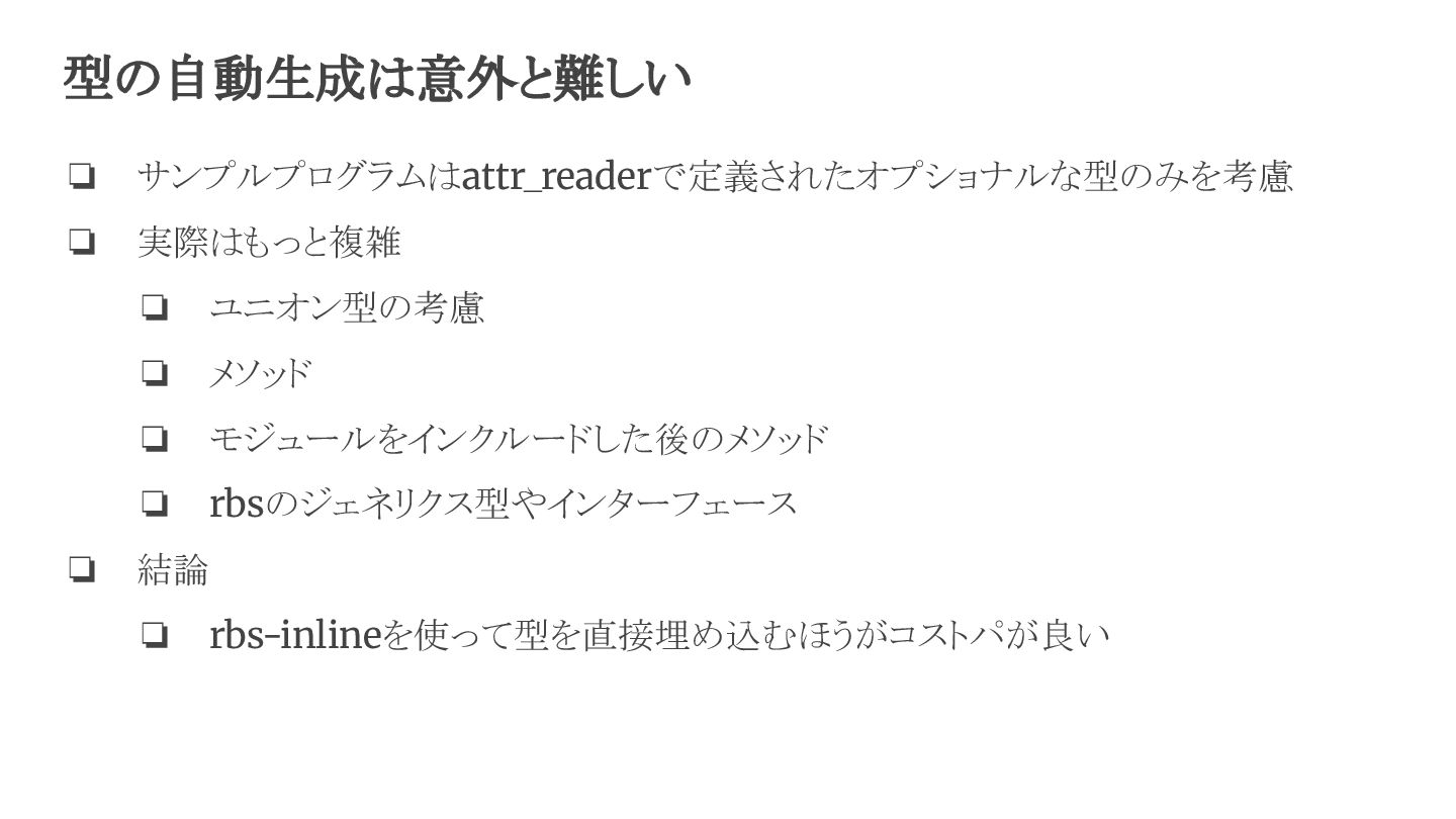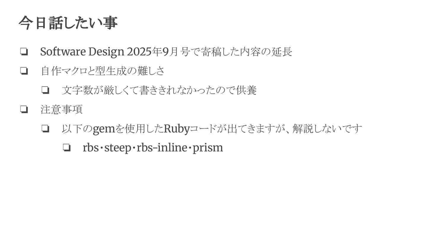 = nil @results = [] end def visit_class_node(node) previous_class_name = @class_name @class_name = node.name visit(node.body) if node.body @class_name = previous_class_name end def visit_call_node(node) return if @class_name.nil? || node.name != :def_nil_bang node.arguments.child_nodes.each do |child_node| @results << { class_name: @class_name, method_name: child_node.value } end end end def generate_def_nil_bangs_rbs(rbs_env, ruby_path, io) result = Prism.parse(File.read(ruby_path)) return unless result.success? visitor = DefNilBangVisitor.new visitor.visit(result.value) return if visitor.results.empty? sigs = visitor.results.filter_map do |result| type_name = RBS::TypeName.new( namespace: RBS::Namespace.parse('::'), name: result[:class_name] ) rbs_env.class_decls[type_name].primary.decl.members.filter_map do |member| if member.is_a?(RBS::AST::Members::AttrReader) && member.type.is_a?(RBS::Types::Optional) && member.name == result[:method_name].to_sym <<~"RBS" class #{type_name} def #{result[:method_name]}!: () -> #{member.type.type} end RBS end end end io.puts sigs.join("\n") end def_nil_bangマクロ 型の生成処理