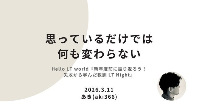 Hello LT world『新年度前に振り返ろう! 失敗から学んだ教訓 LT Night』 2026.3.11 あき(aki366) 思っているだけでは 何も変わらない