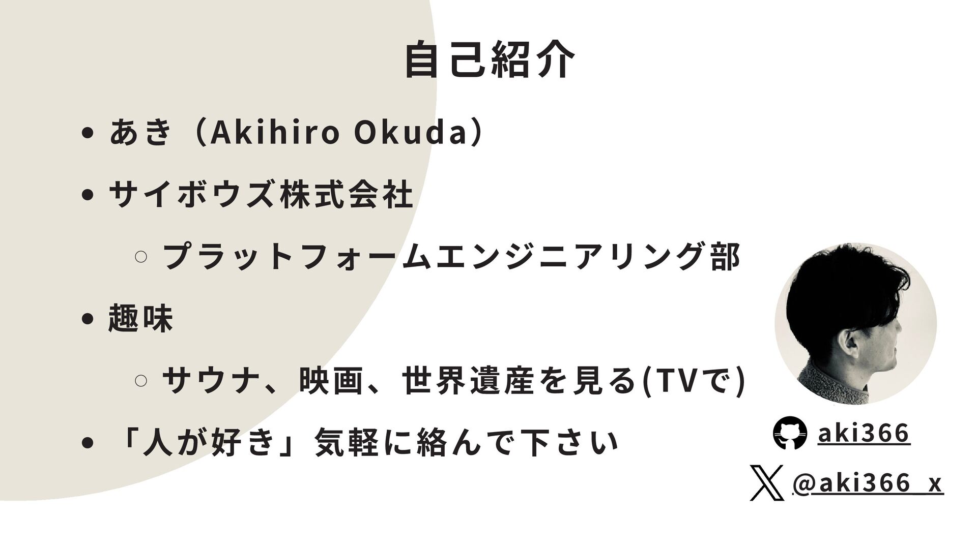 あき(Akihiro Okuda) サイボウズ株式会社 プラットフォームエンジニアリング部 趣味 サウナ、映画、世界遺産を見る(TVで) 「人が好き」気軽に絡んで下さい @aki366_x aki366 自己紹介