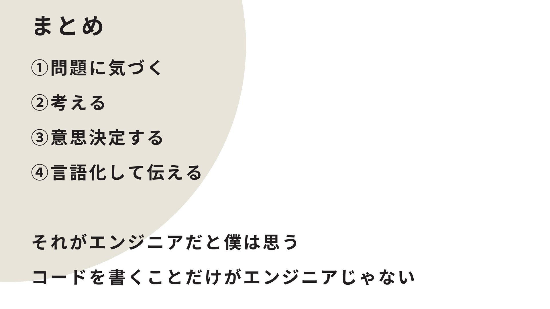 まとめ ①問題に気づく ②考える ③意思決定する ④言語化して伝える それがエンジニアだと僕は思う コードを書くことだけがエンジニアじゃない