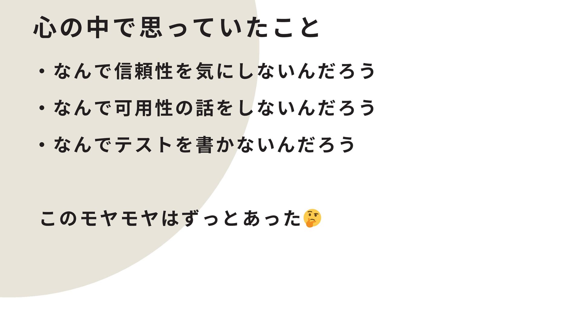 心の中で思っていたこと ・なんで信頼性を気にしないんだろう ・なんで可用性の話をしないんだろう ・なんでテストを書かないんだろう このモヤモヤはずっとあった 🤔