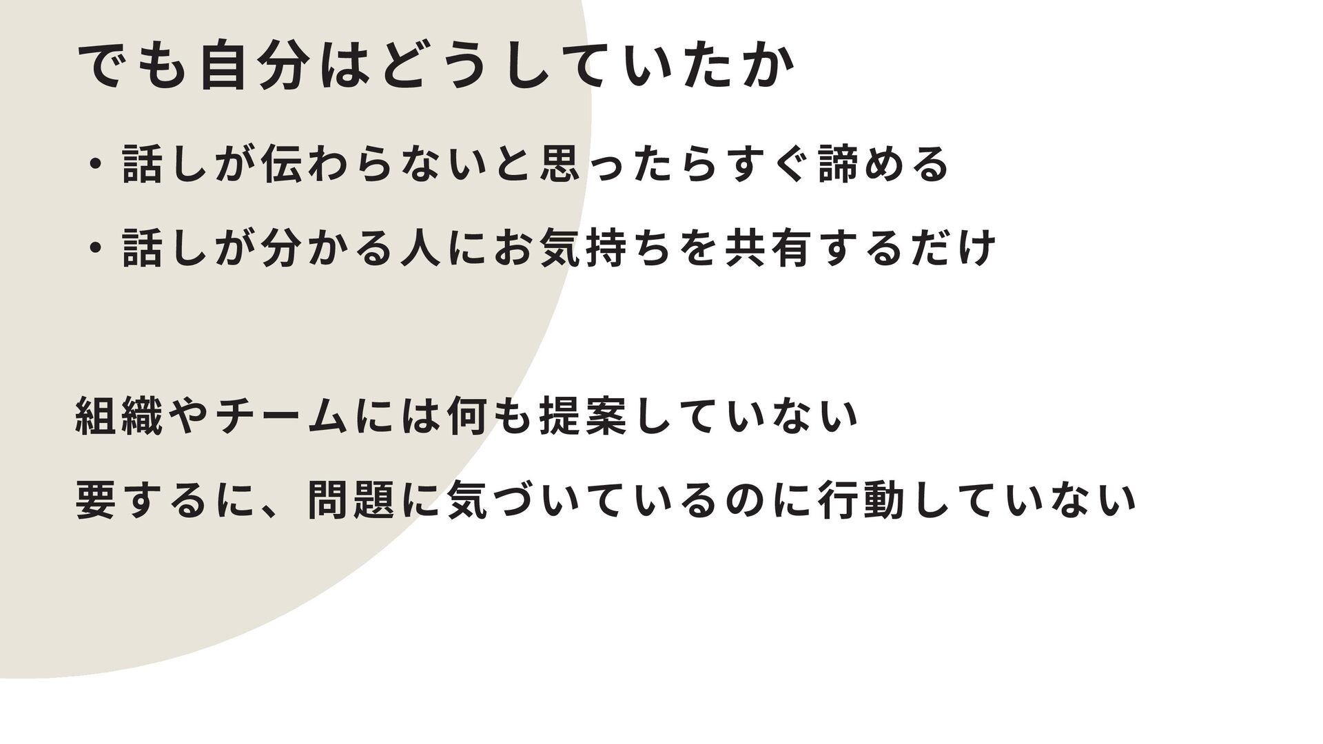 でも自分はどうしていたか ・話しが伝わらないと思ったらすぐ諦める ・話しが分かる人にお気持ちを共有するだけ 組織やチームには何も提案していない 要するに、問題に気づいているのに行動していない