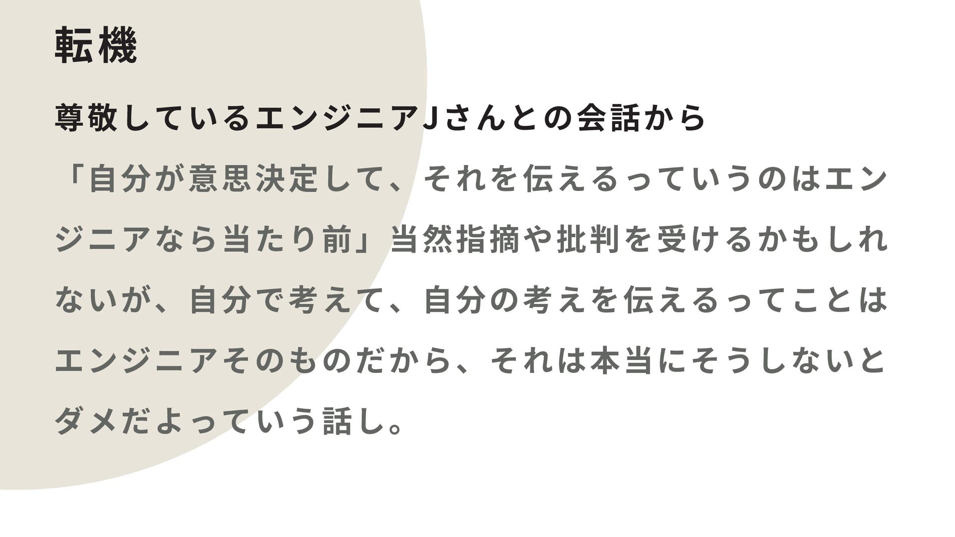 転機 尊敬しているエンジニアJさんとの会話から 「自分が意思決定して、それを伝えるっていうのはエン ジニアなら当たり前」当然指摘や批判を受けるかもしれ ないが、自分で考えて、自分の考えを伝えるってことは エンジニアそのものだから、それは本当にそうしないと ダメだよっていう話し。
