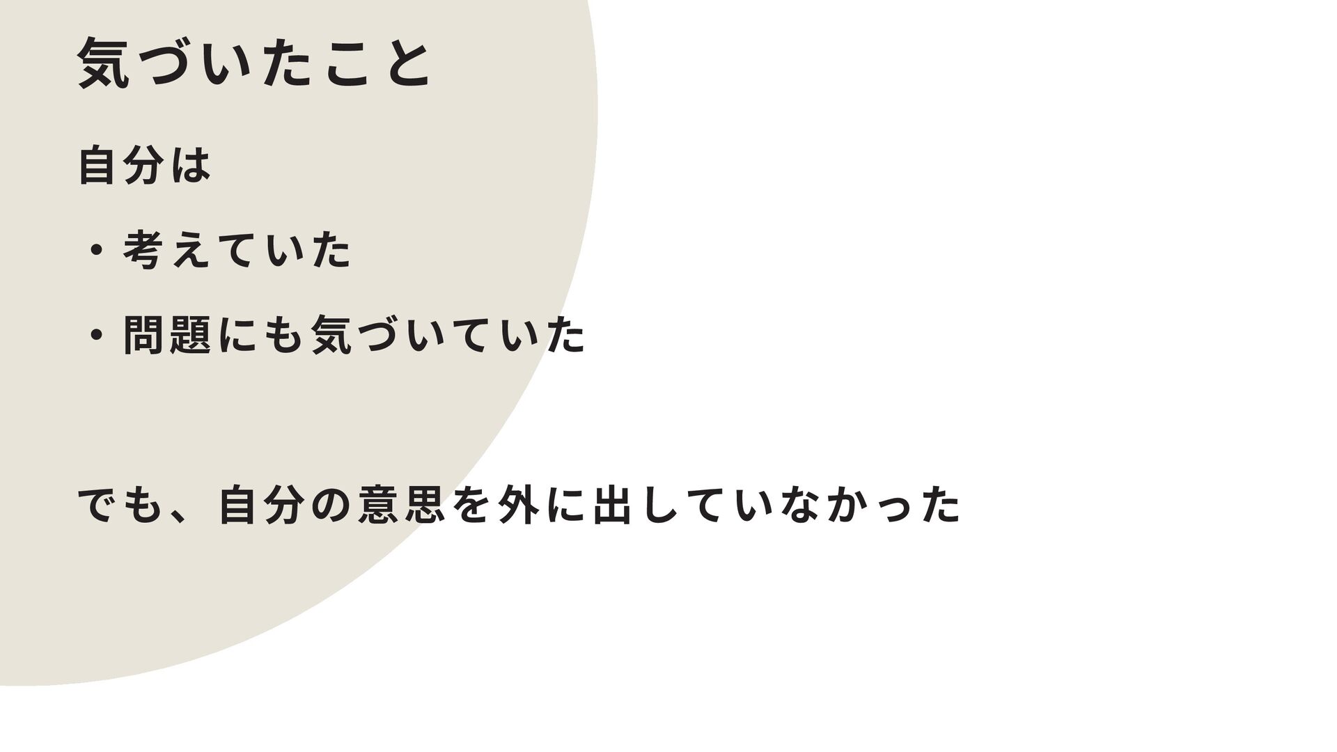 気づいたこと 自分は ・考えていた ・問題にも気づいていた でも、自分の意思を外に出していなかった