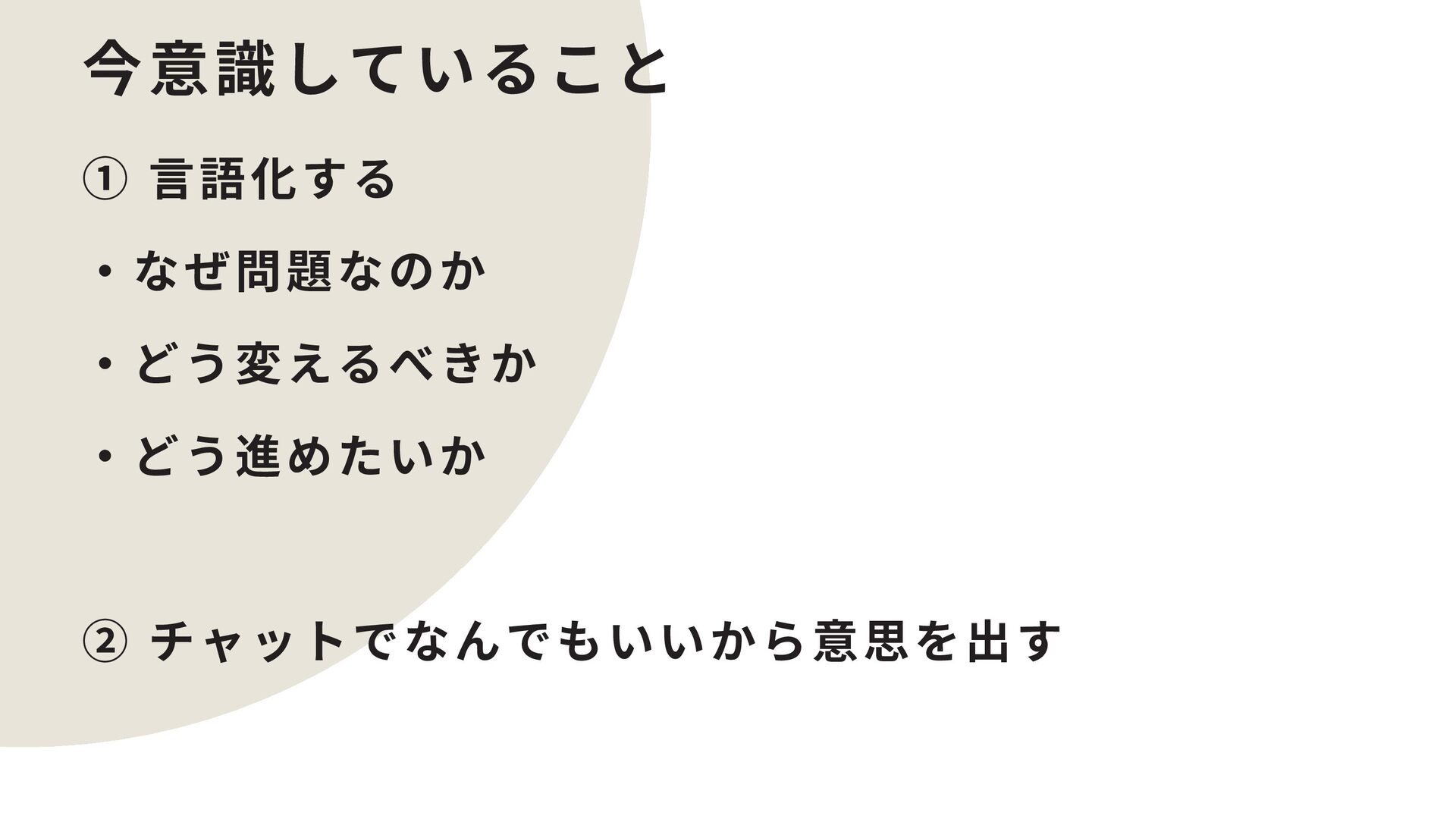 今意識していること ① 言語化する ・なぜ問題なのか ・どう変えるべきか ・どう進めたいか ② チャットでなんでもいいから意思を出す
