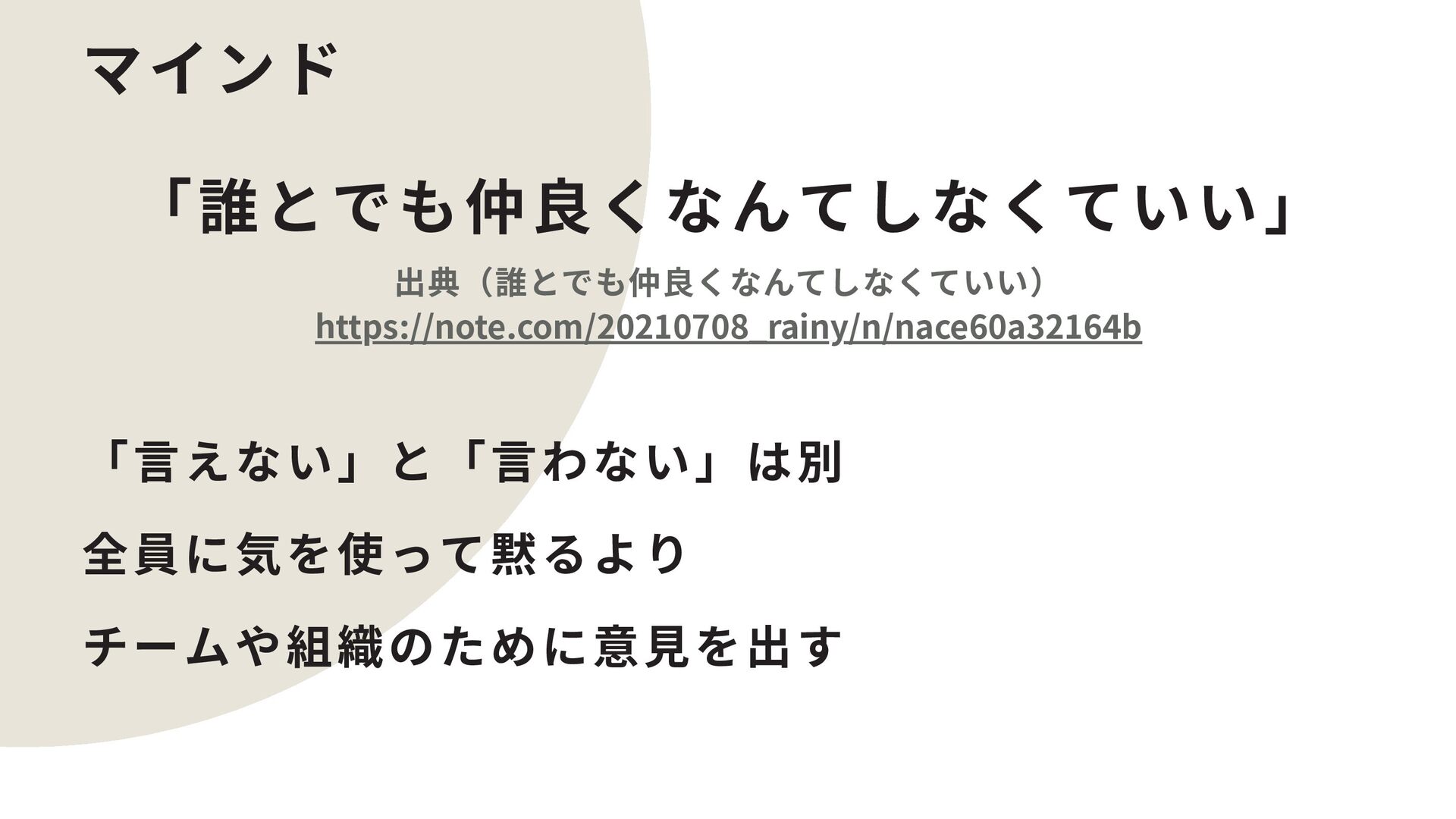 マインド 「言えない」と「言わない」は別 全員に気を使って黙るより チームや組織のために意見を出す 「誰とでも仲良くなんてしなくていい」 出典(誰とでも仲良くなんてしなくていい) https://note.com/20210708_rainy/n/nace60a32164b