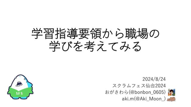 学習指導要領から職場の 学びを考えてみる 2024/8/24 スクラムフェス仙台2024 おがさわら(@bonbon_0605) aki.m(@Aki_Moon_)