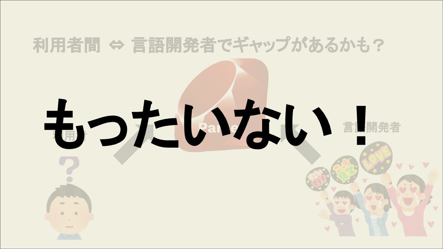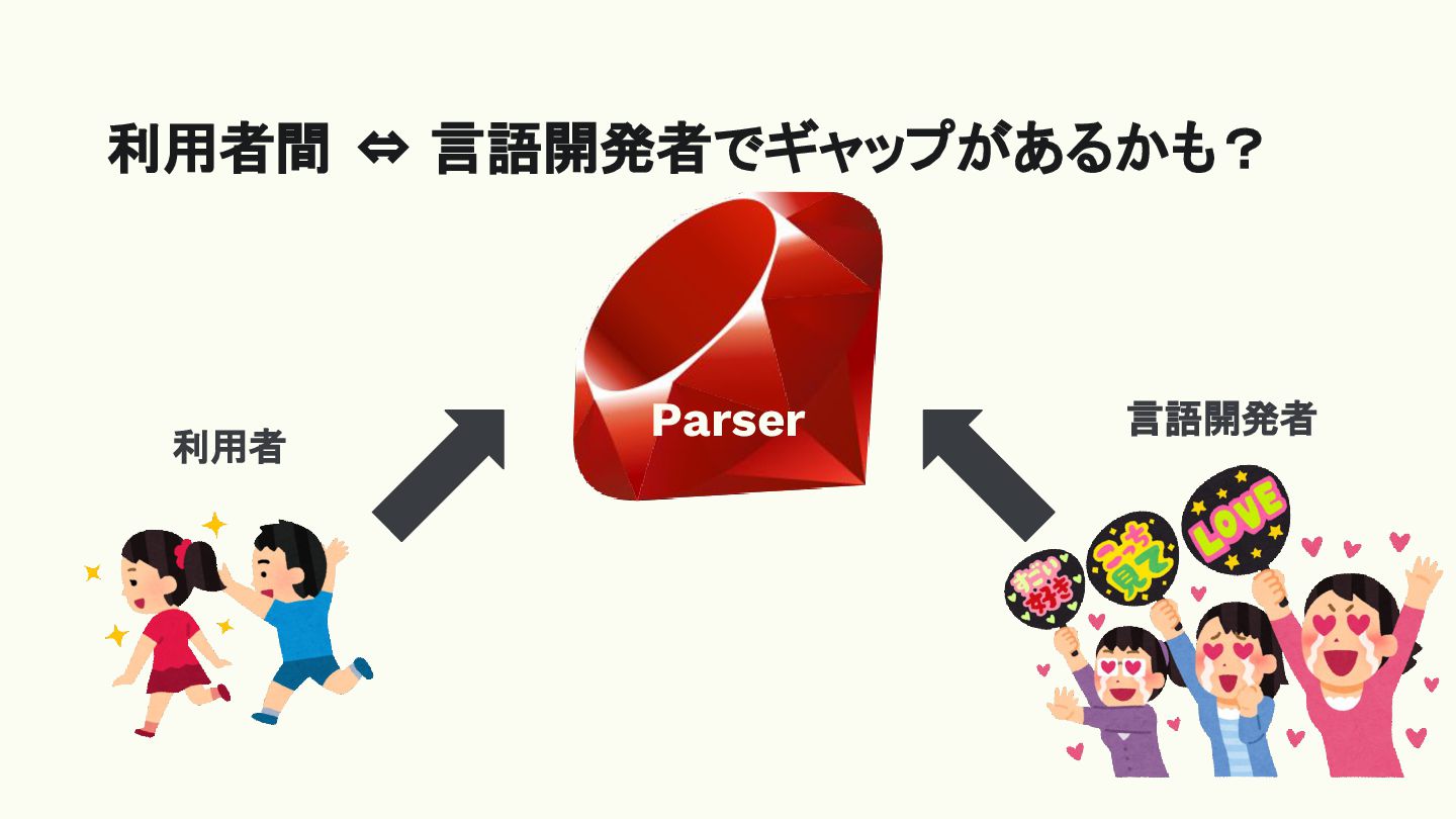 利用者間 ⇔ 言語開発者でギャップがあるかも? Parser 言語開発者 利用者 もったいない!