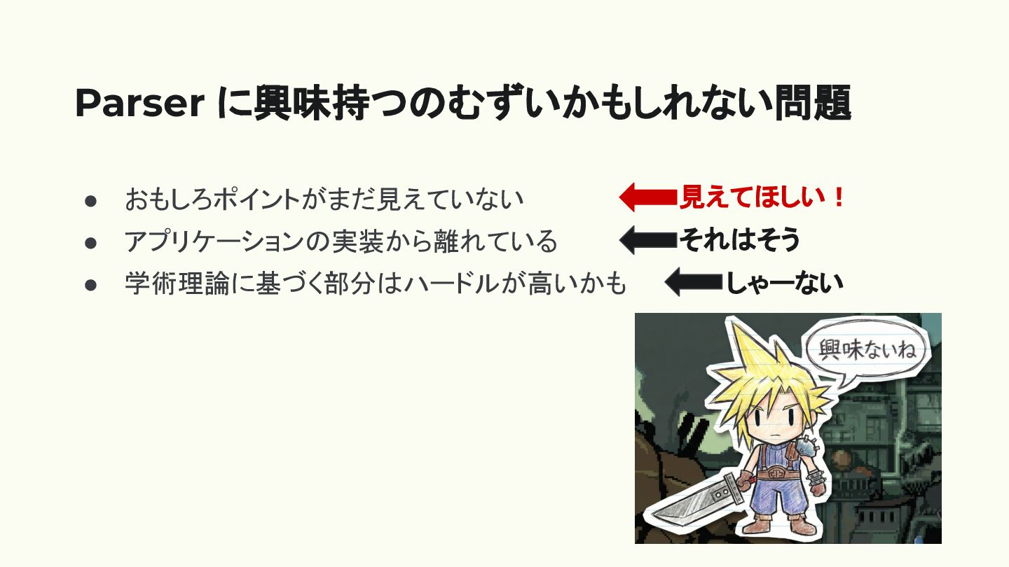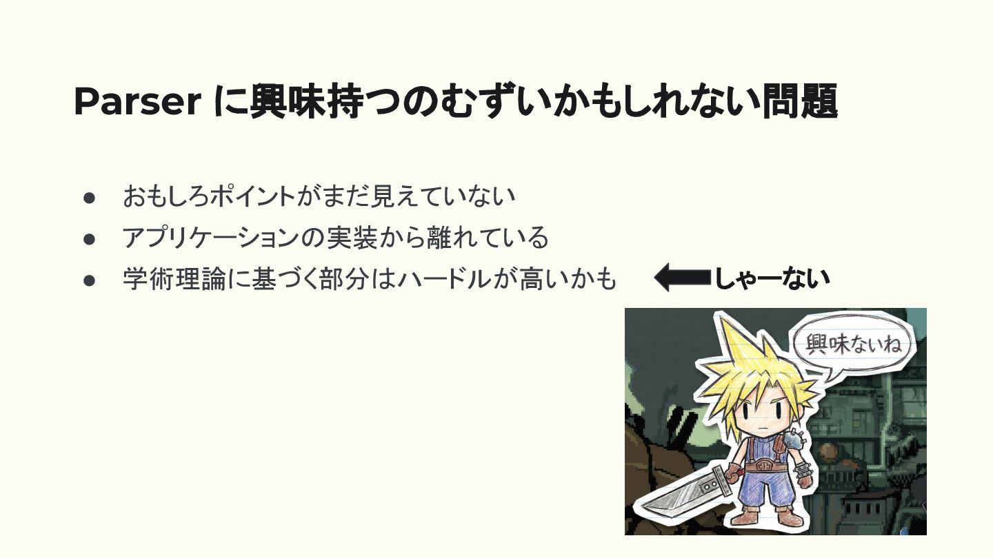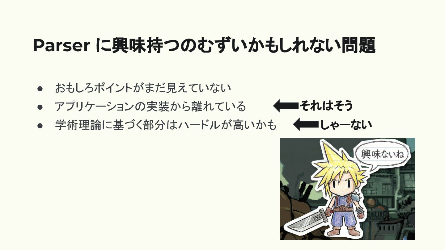 • おもしろポイントがまだ見えていない • アプリケーションの実装から離れている • 学術理論に基づく部分はハードルが高いかも Parser に興味持つのむずいかもしれない問題 しゃーない それはそう
