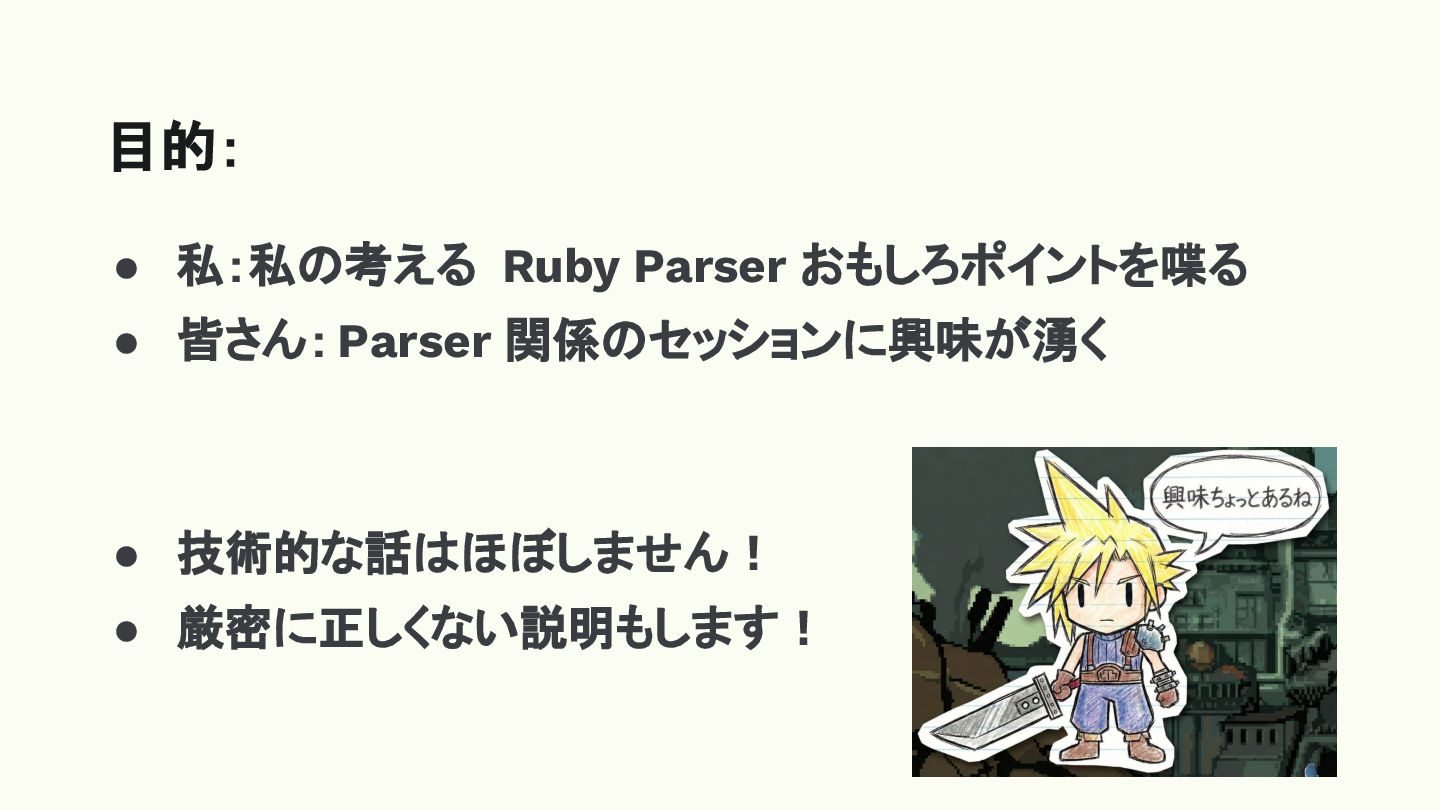• 私:私の考える Ruby Parser おもしろポイントを喋る • 皆さん:Parser 関係のセッションに興味が湧く • 技術的な話はほぼしません!