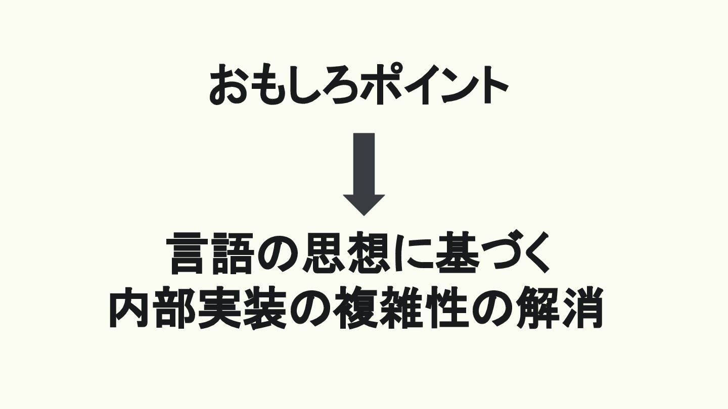おもしろポイント 言語の思想に基づく 内部実装の複雑性の解消
